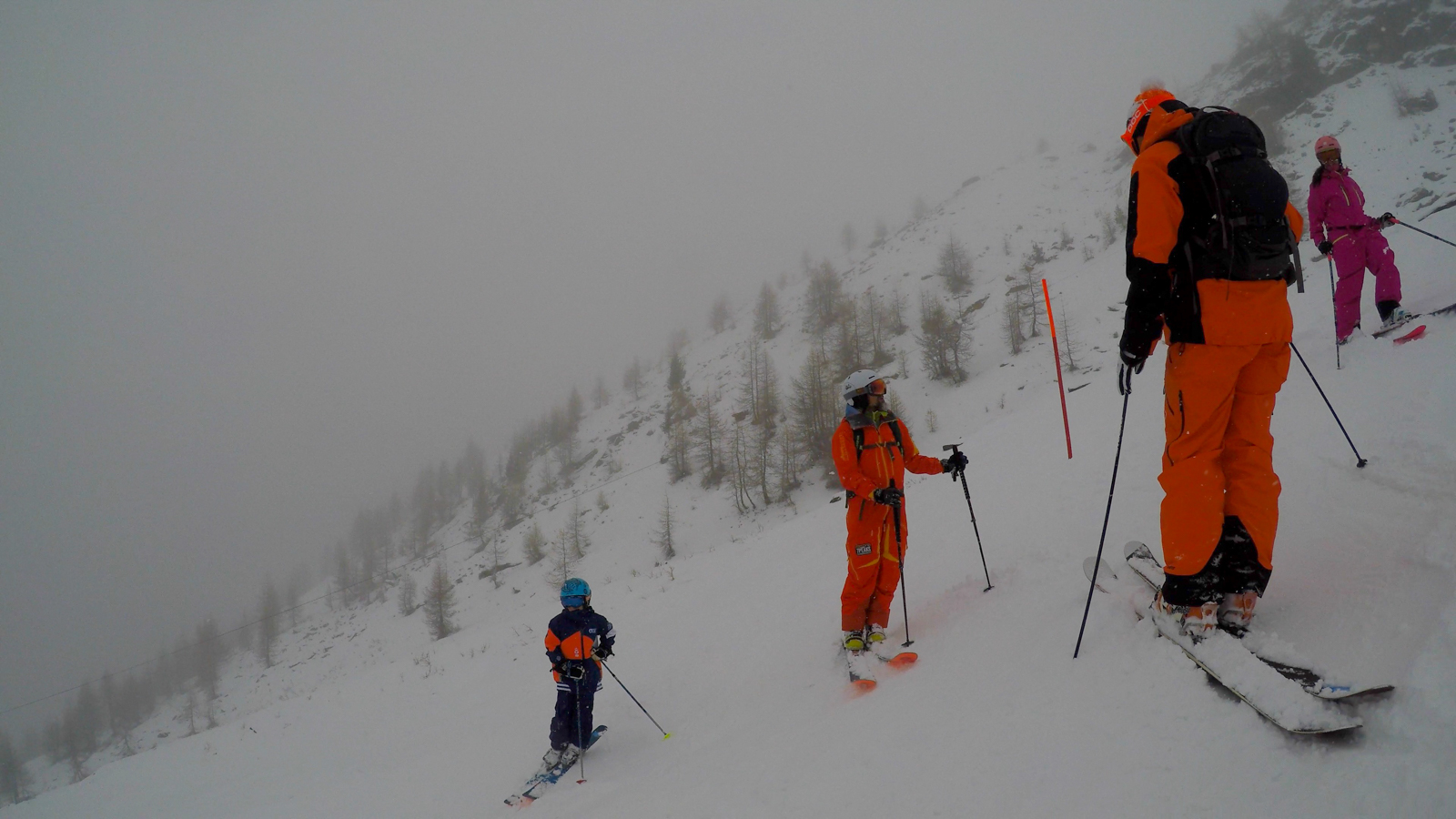 Le lendemain ce n’est plus le brouillard qui est contre nous mais de fortes rafales de vent qui menacent l’ouverture des installations. Fort heureusement, il est un peu tombé vers 10h30 et nous pouvons rejoindre les cimes. Les virages s’effectuent au gré des descentes, en ayant de bonnes sensations. Puis il faut bien prévoir le retour après un week-end de rigolades.