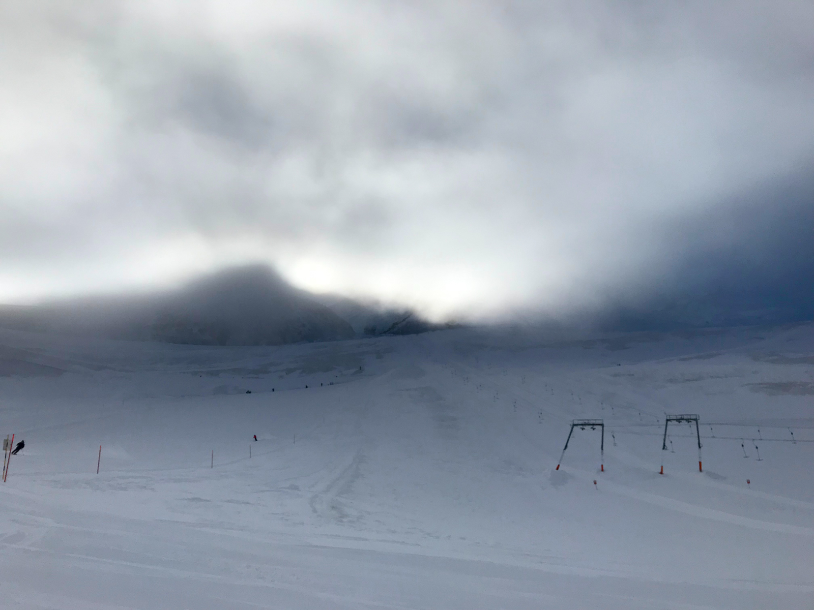 Entre vent, neige et brouillard, notre première journée est compliquée mais cela ne nous empêche pas d’avoir du plaisir. Il faut retrouver les vieux réflexes… Une carte mémoire nous complique la tâche, heureusement vite résolu. En fin de journée, après une bonne douche chaude, nous sortons nous restaurer et nous hydrater avec quelques bières.