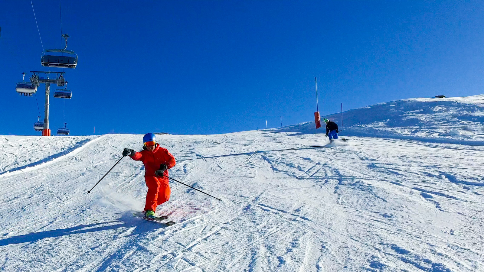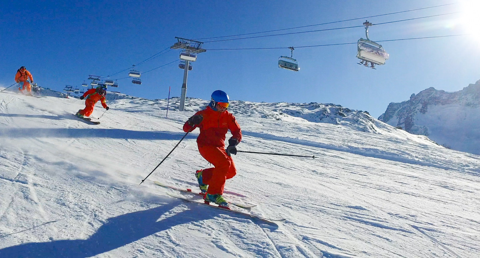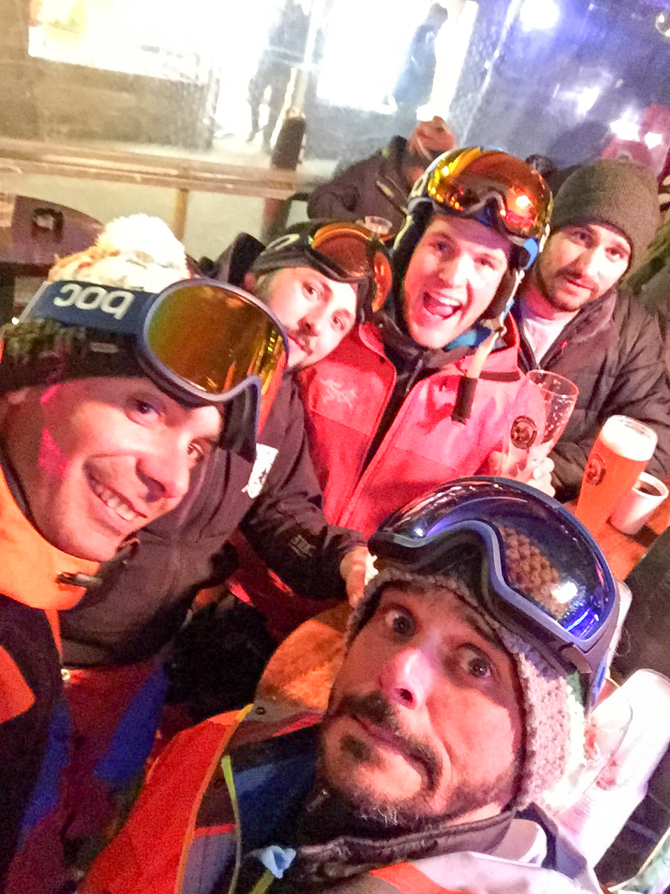Tous habillés en orange, nous sommes facilement reconnaissables. Toute la journée est couplée de fous-rires, de gros virages, de switch, et bien entendu de quelques bières. Entre discussions, rires, photos, nous nous retrouvons alors les derniers sur les pistes. Il est temps de redescendre.