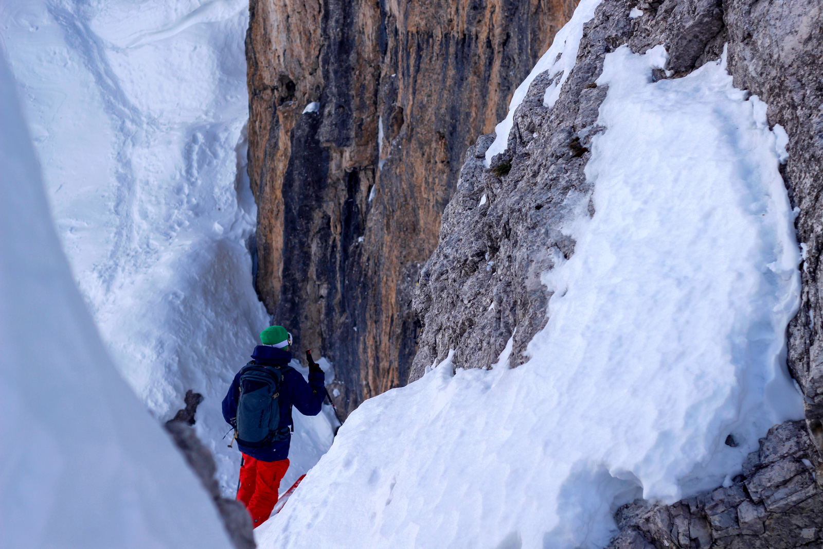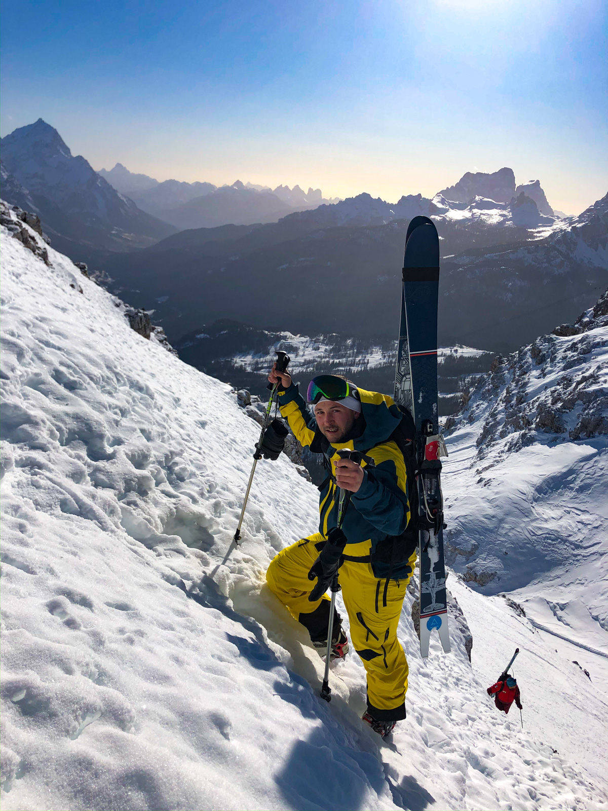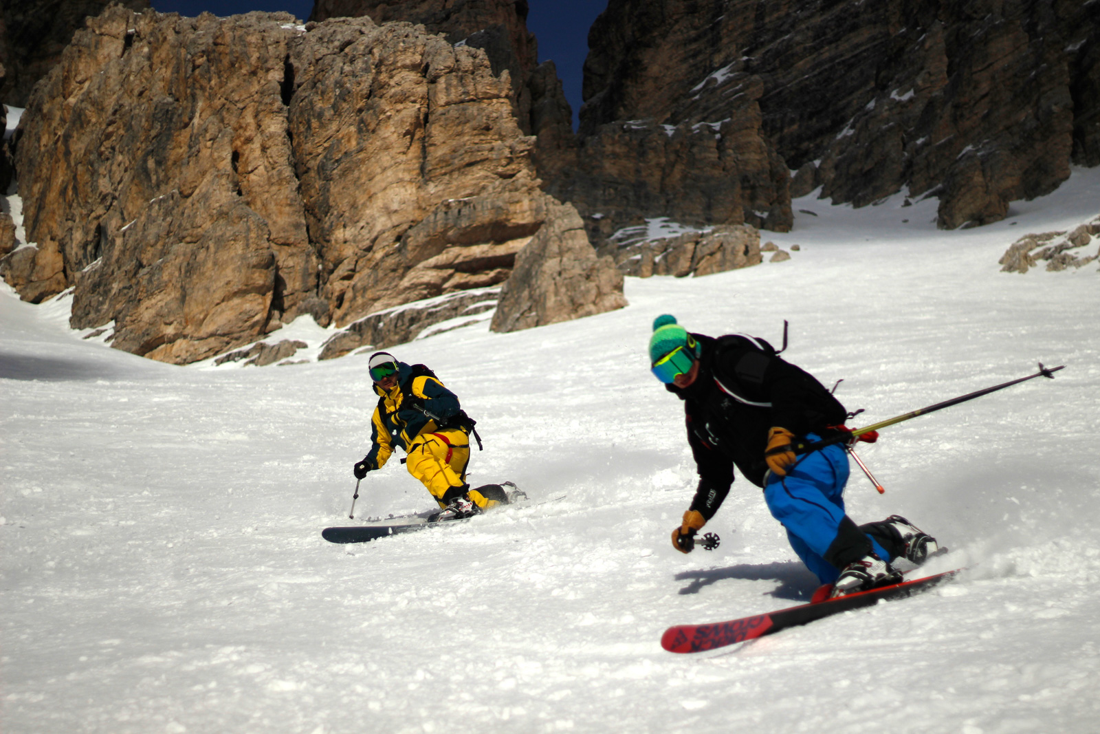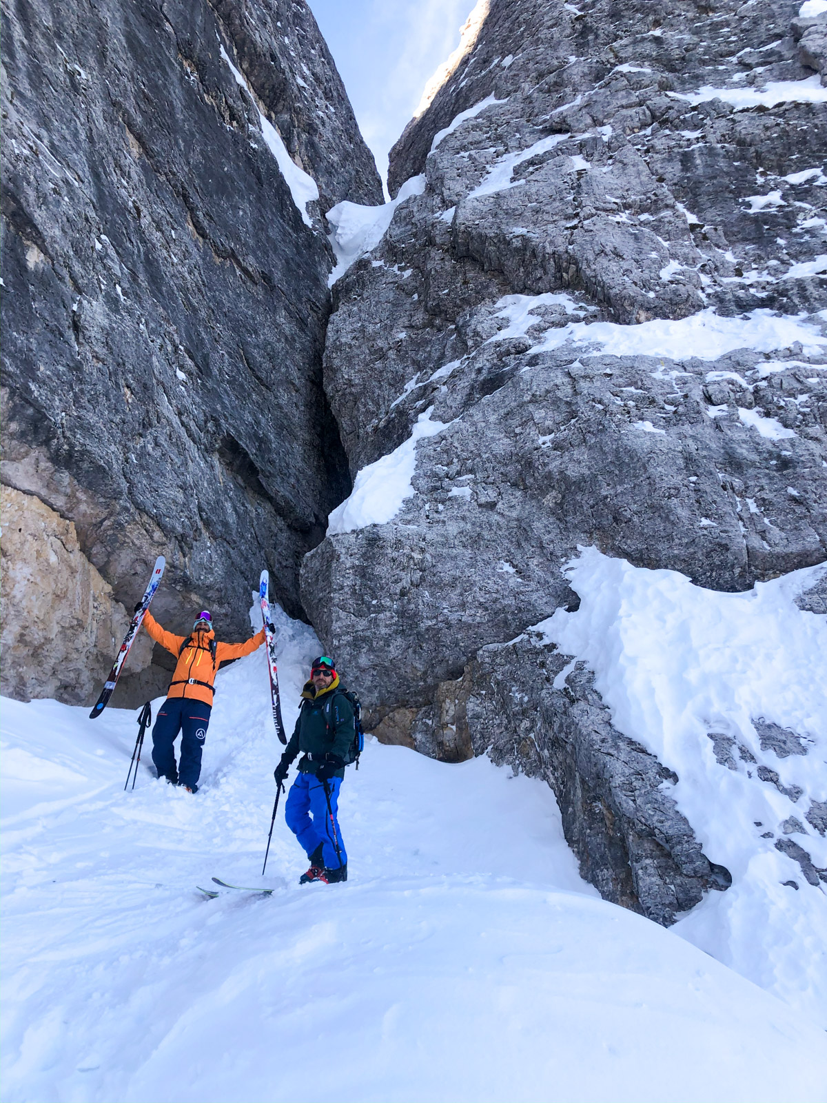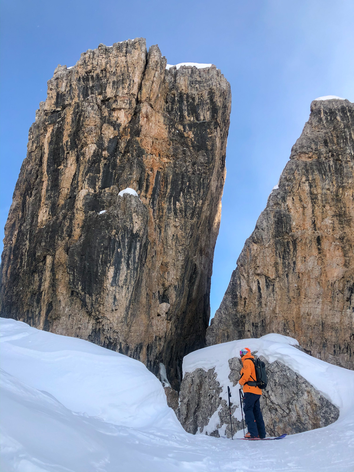 Samedi, dernière journée de ski dans les Dolomites, nous partons à 6h du matin pour admirer le lever du soleil derrière les montagnes. C’est notre «journée pachon». Il fait beau et chaud, une incroyable session, remplie de rires et de gamelles sur la piste. Nous terminons ainsi notre semaine italienne avec un dernier passage par le Bus de Tofana son couloir juste derrière et une halte au refuge d’Angelo Dibona.