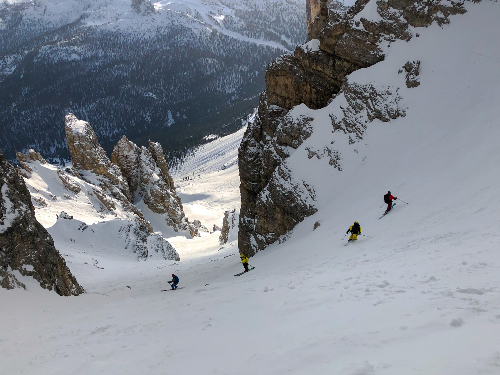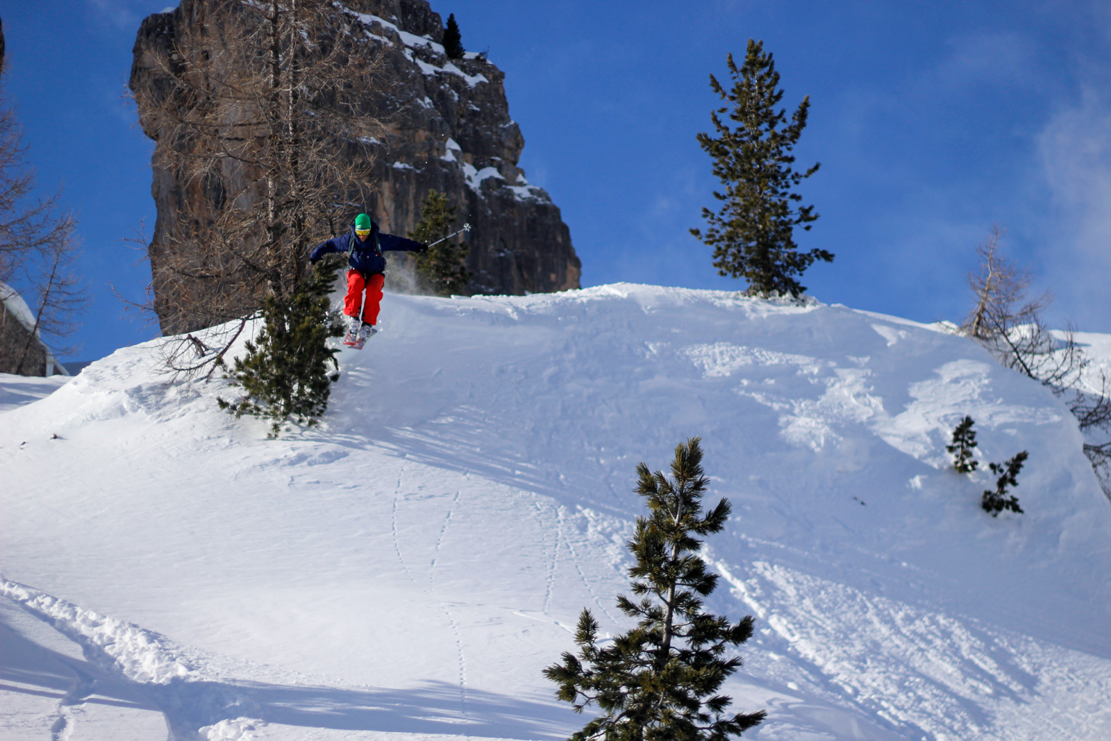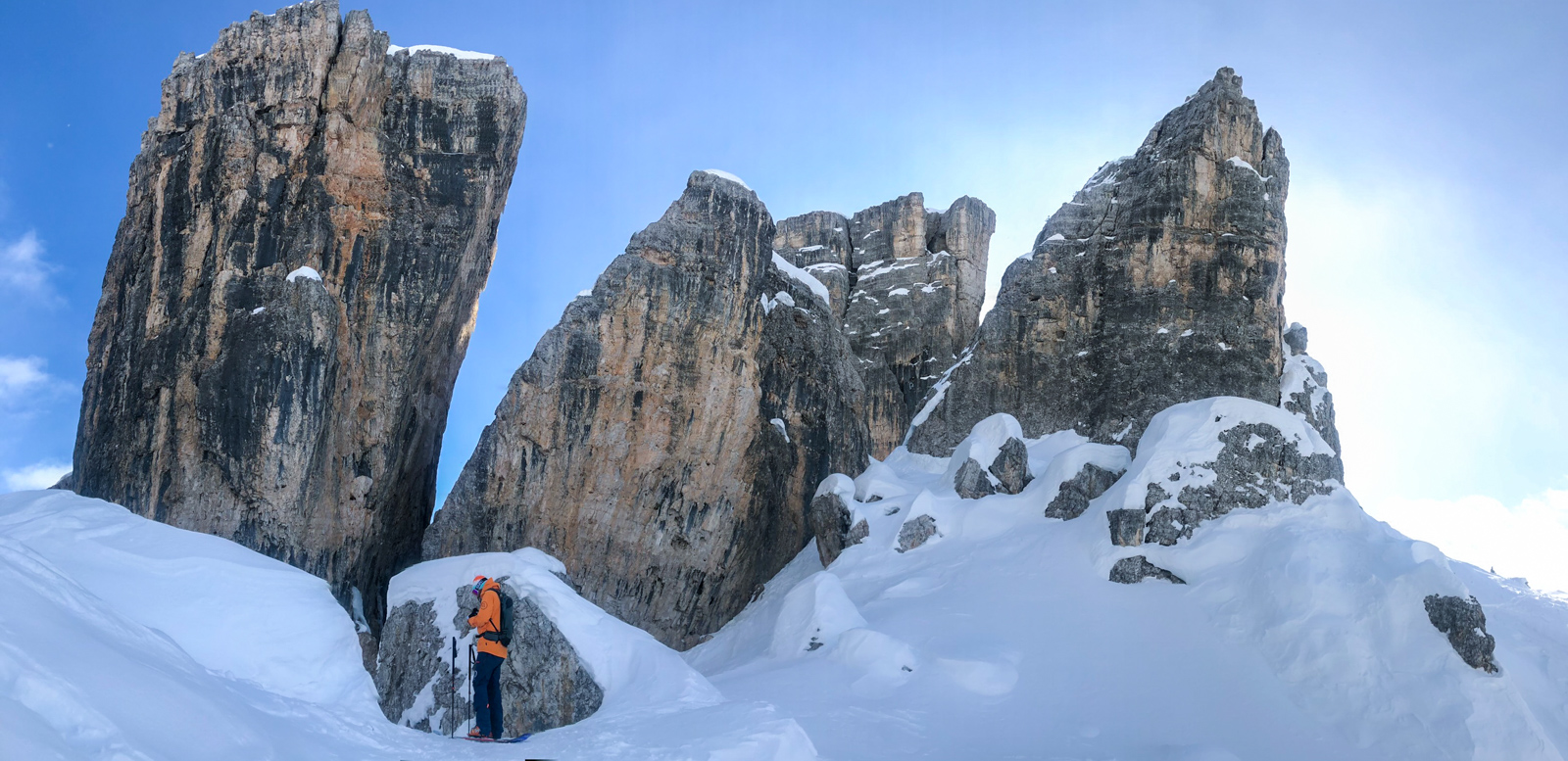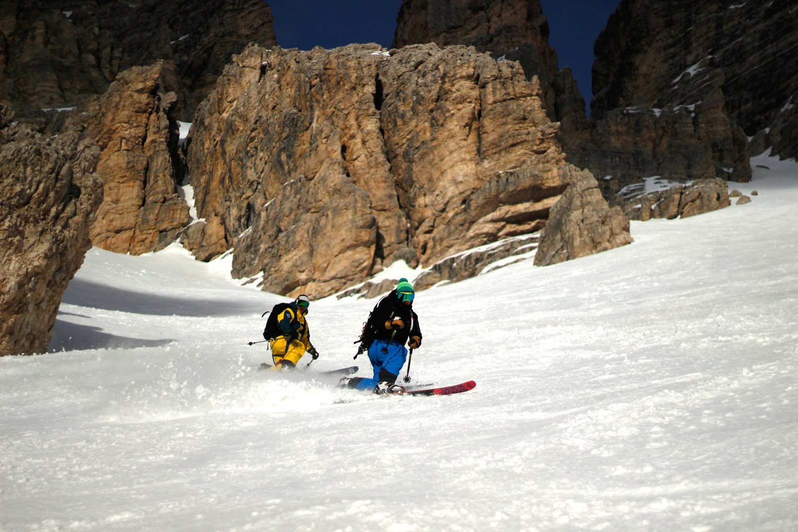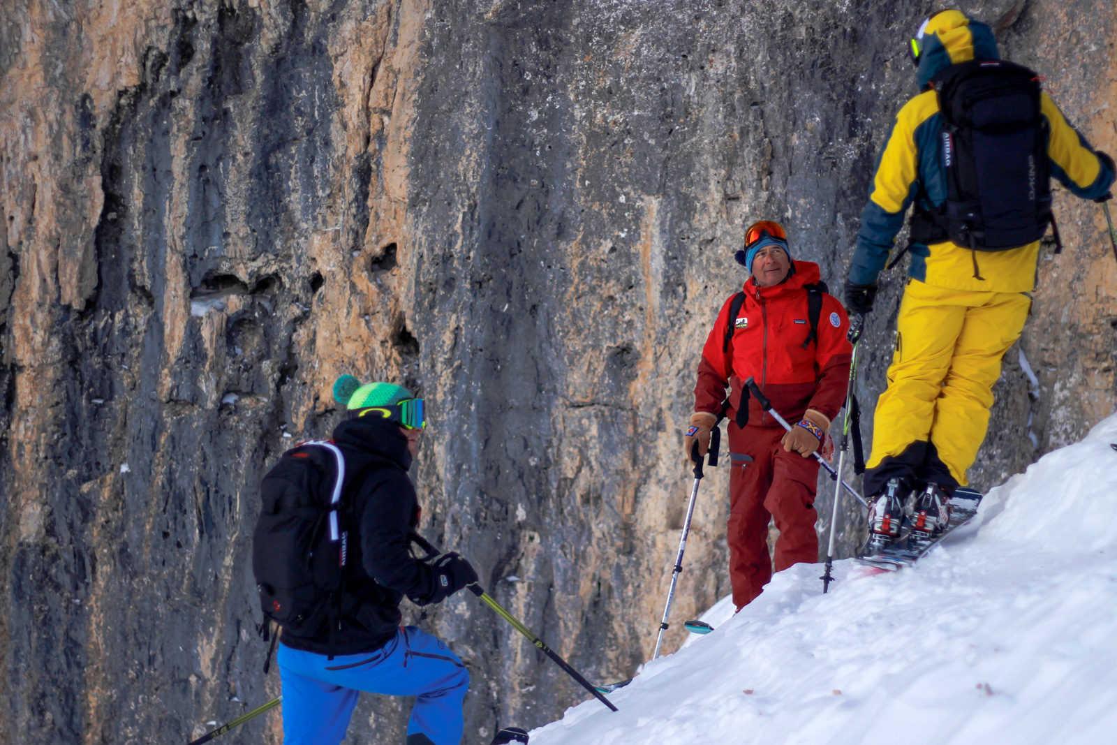 Samedi, dernière journée de ski dans les Dolomites, nous partons à 6h du matin pour admirer le lever du soleil derrière les montagnes. C’est notre «journée pachon». Il fait beau et chaud, une incroyable session, remplie de rires et de gamelles sur la piste. Nous terminons ainsi notre semaine italienne avec un dernier passage par le Bus de Tofana son couloir juste derrière et une halte au refuge d’Angelo Dibona.