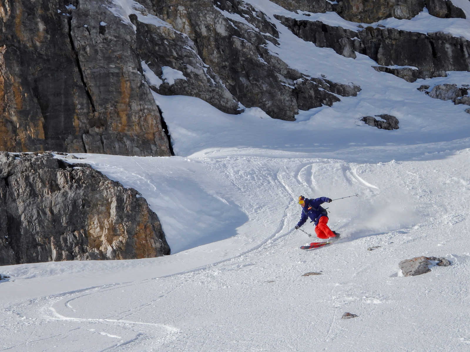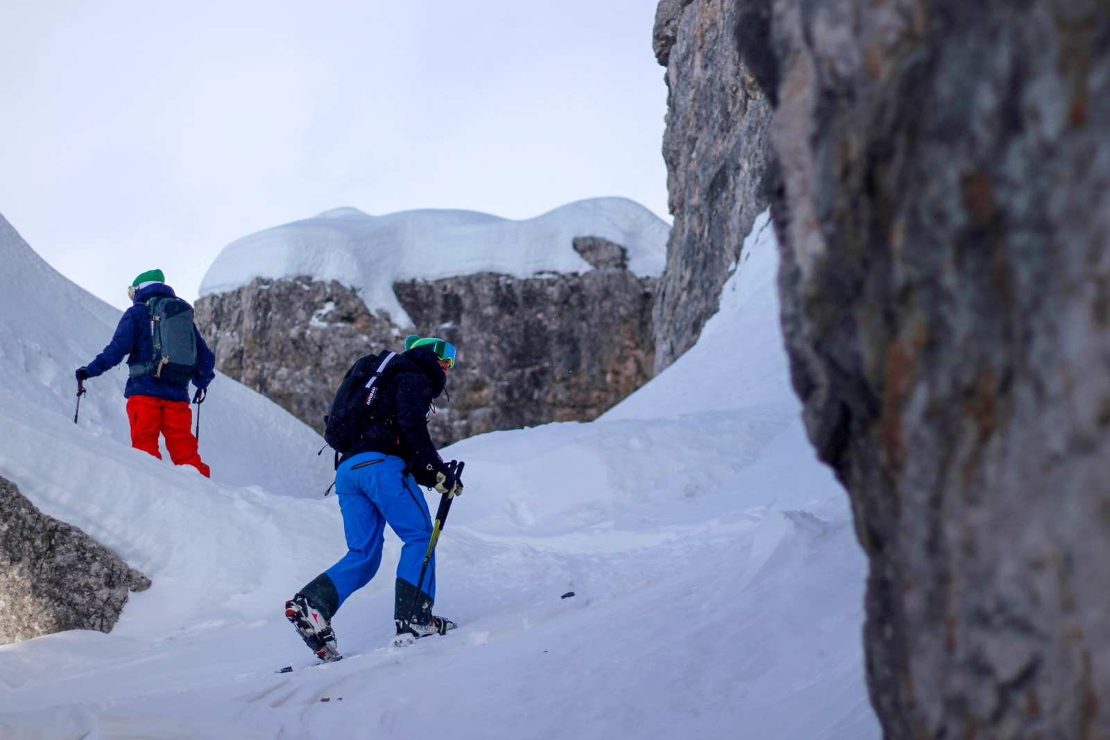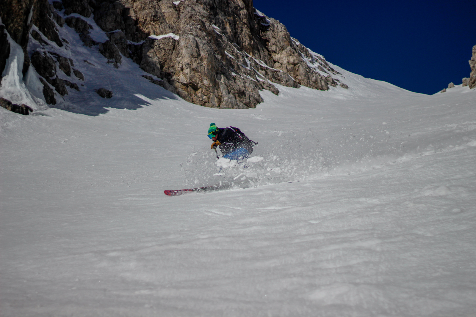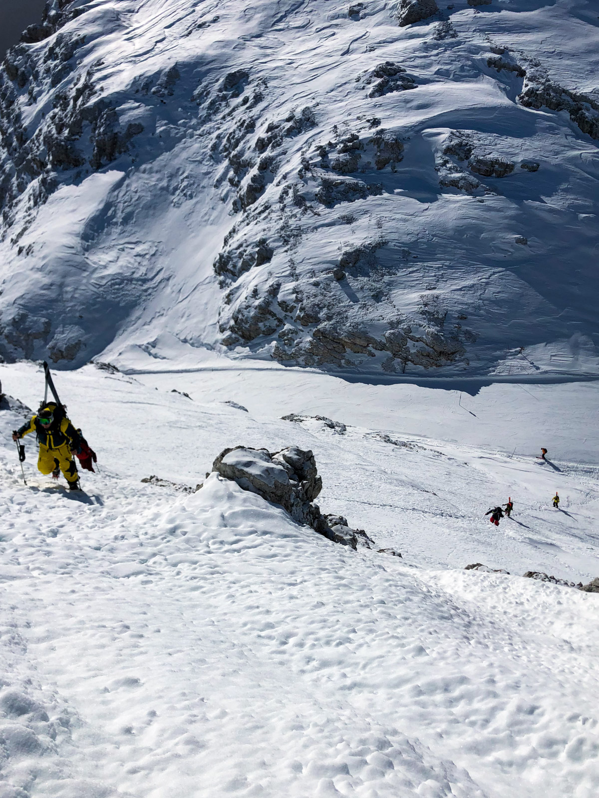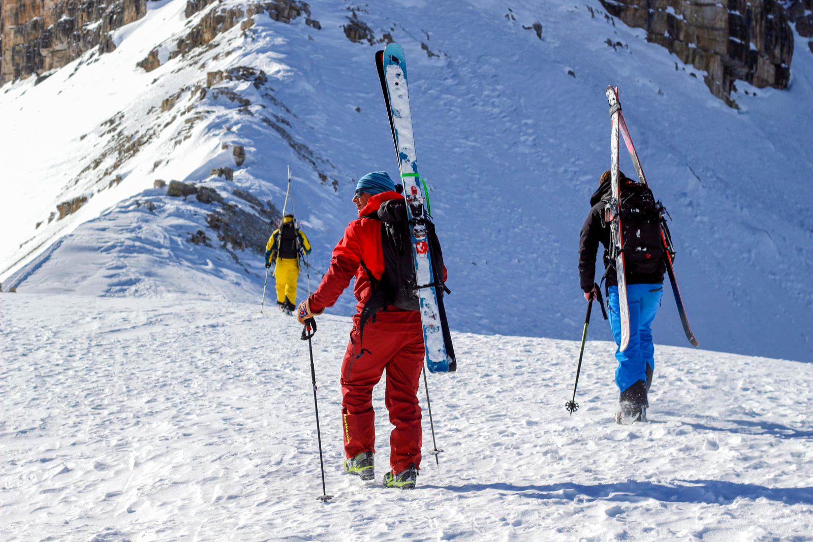 Samedi, dernière journée de ski dans les Dolomites, nous partons à 6h du matin pour admirer le lever du soleil derrière les montagnes. C’est notre «journée pachon». Il fait beau et chaud, une incroyable session, remplie de rires et de gamelles sur la piste. Nous terminons ainsi notre semaine italienne avec un dernier passage par le Bus de Tofana son couloir juste derrière et une halte au refuge d’Angelo Dibona.