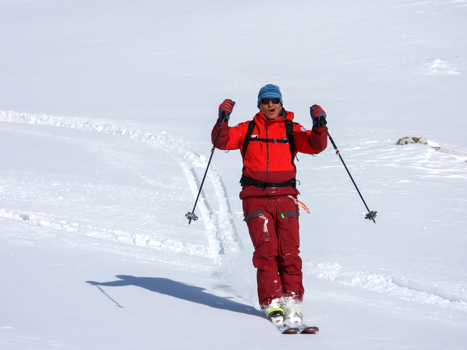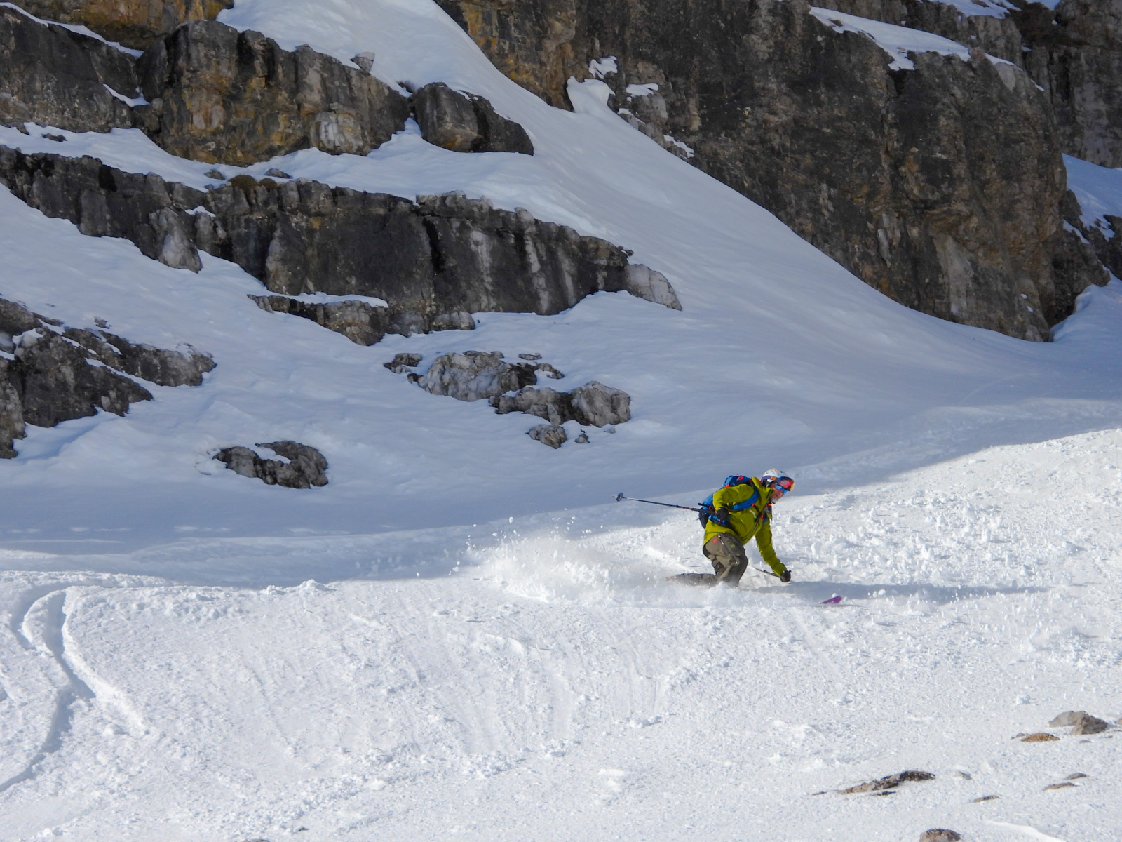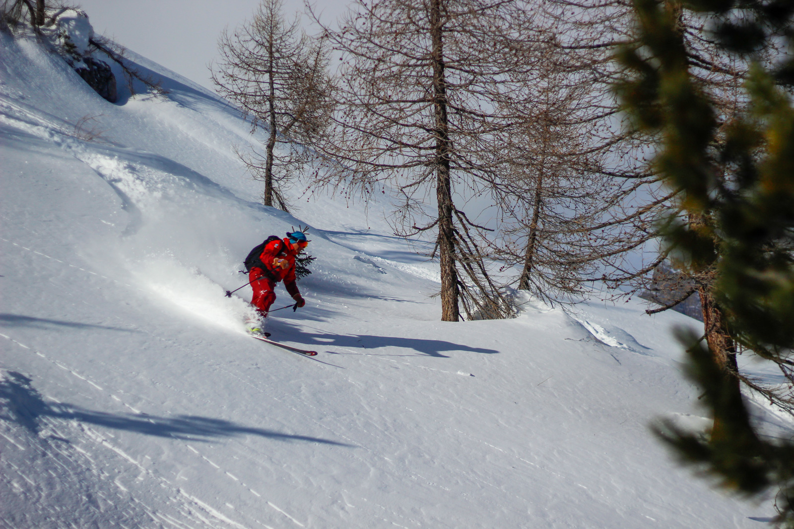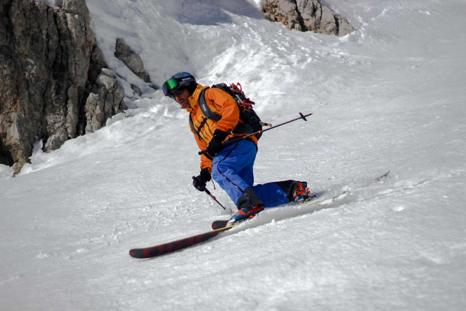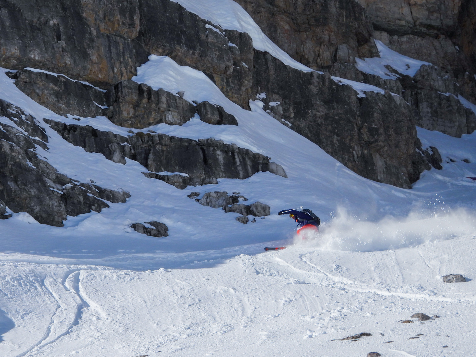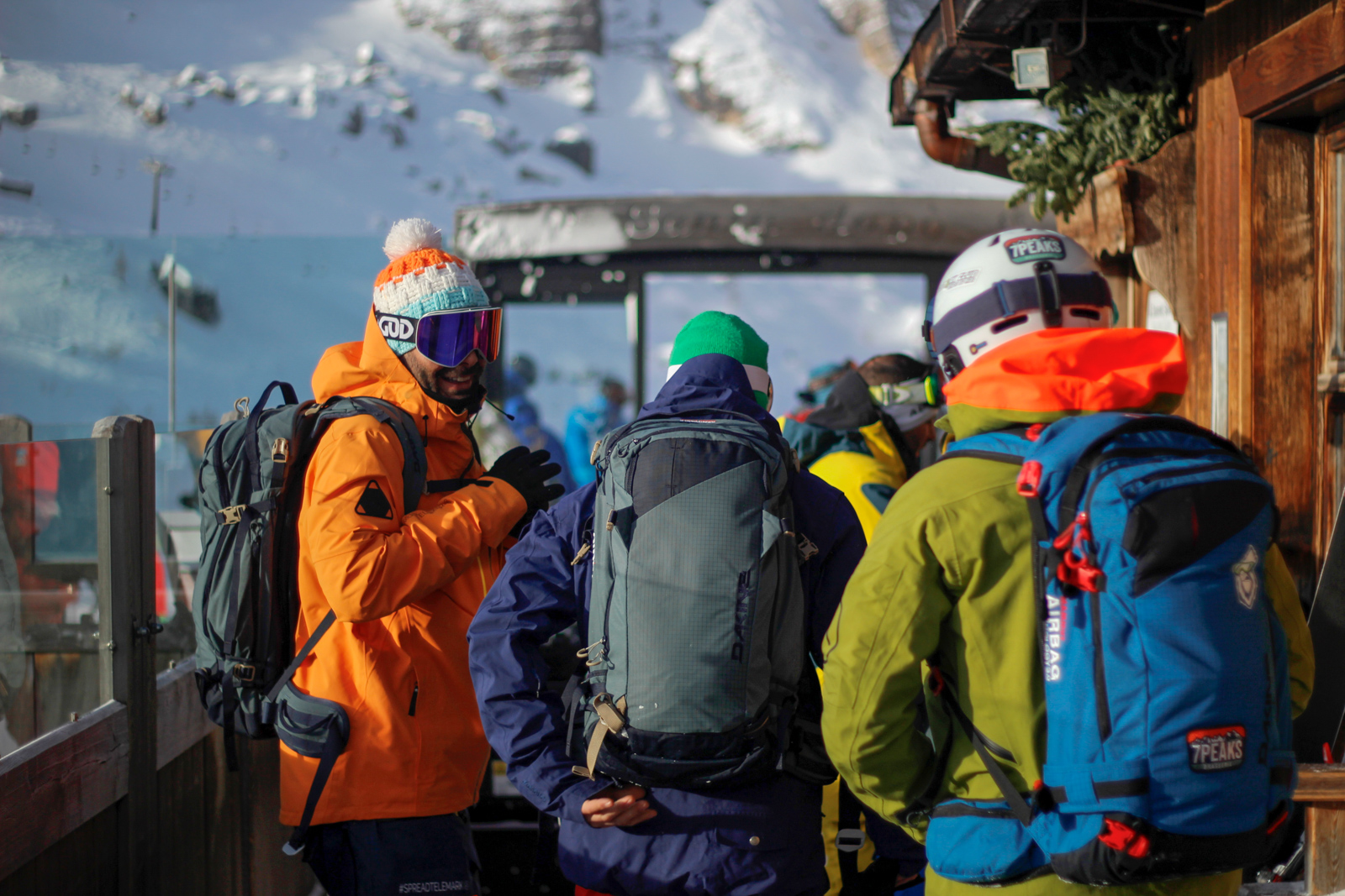 Samedi, dernière journée de ski dans les Dolomites, nous partons à 6h du matin pour admirer le lever du soleil derrière les montagnes. C’est notre «journée pachon». Il fait beau et chaud, une incroyable session, remplie de rires et de gamelles sur la piste. Nous terminons ainsi notre semaine italienne avec un dernier passage par le Bus de Tofana son couloir juste derrière et une halte au refuge d’Angelo Dibona.