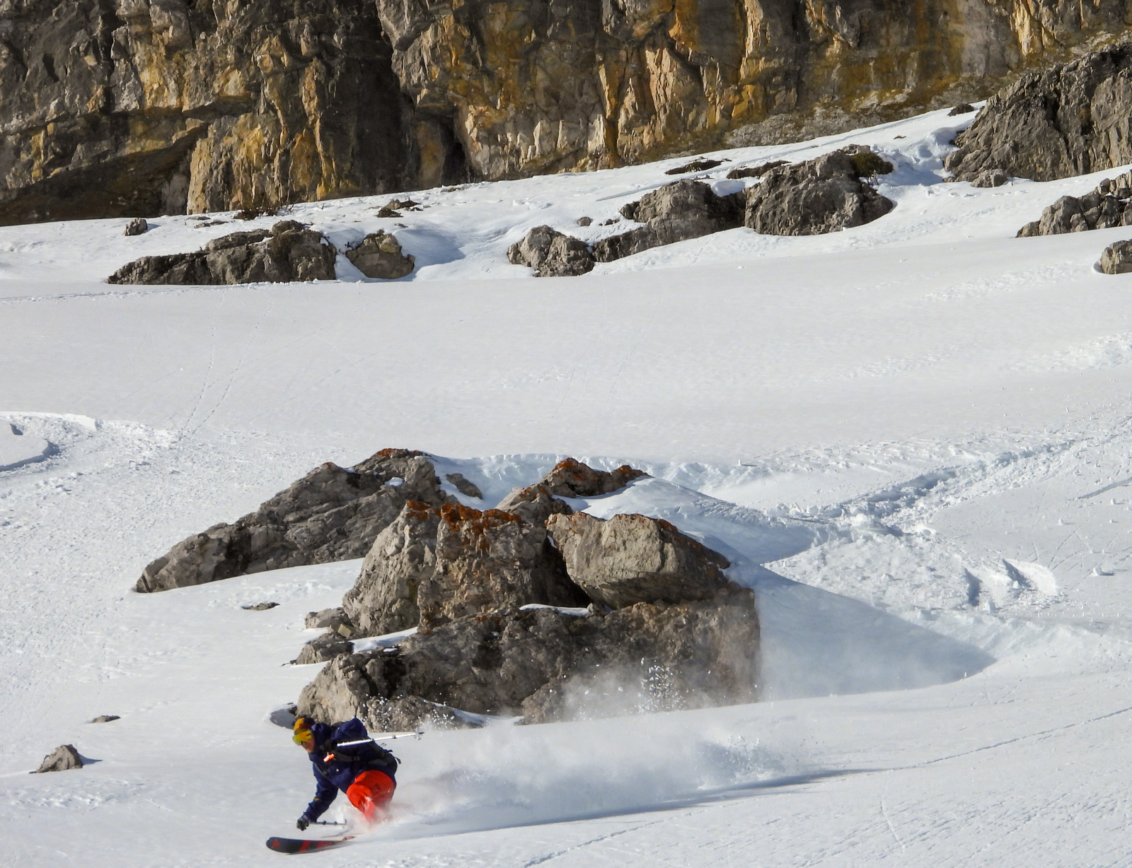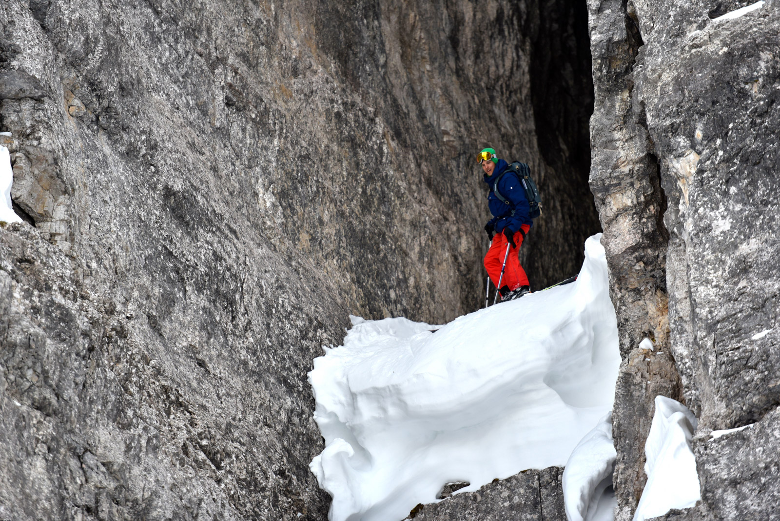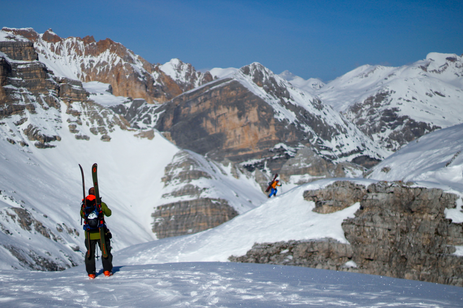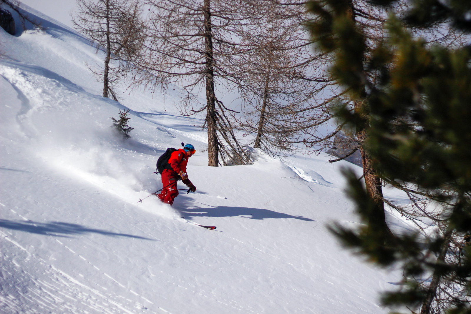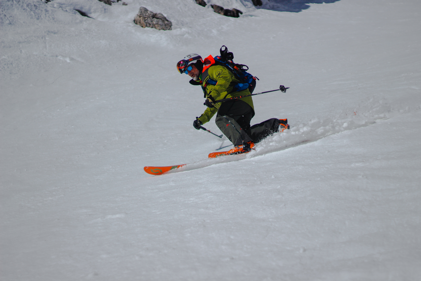 Samedi, dernière journée de ski dans les Dolomites, nous partons à 6h du matin pour admirer le lever du soleil derrière les montagnes. C’est notre «journée pachon». Il fait beau et chaud, une incroyable session, remplie de rires et de gamelles sur la piste. Nous terminons ainsi notre semaine italienne avec un dernier passage par le Bus de Tofana son couloir juste derrière et une halte au refuge d’Angelo Dibona.