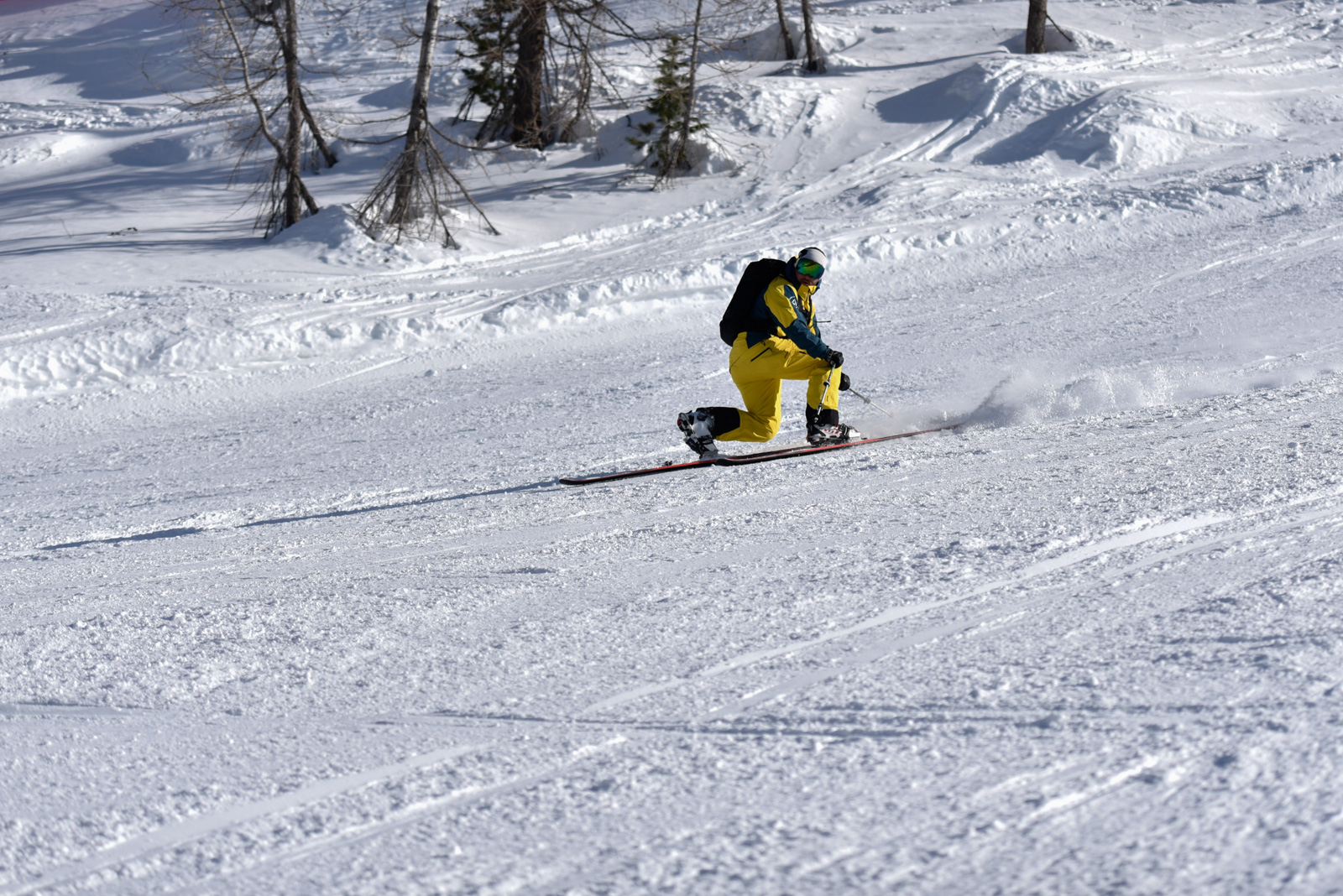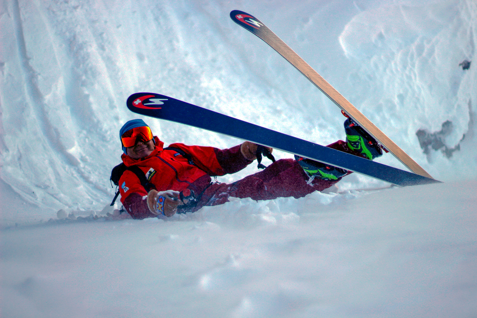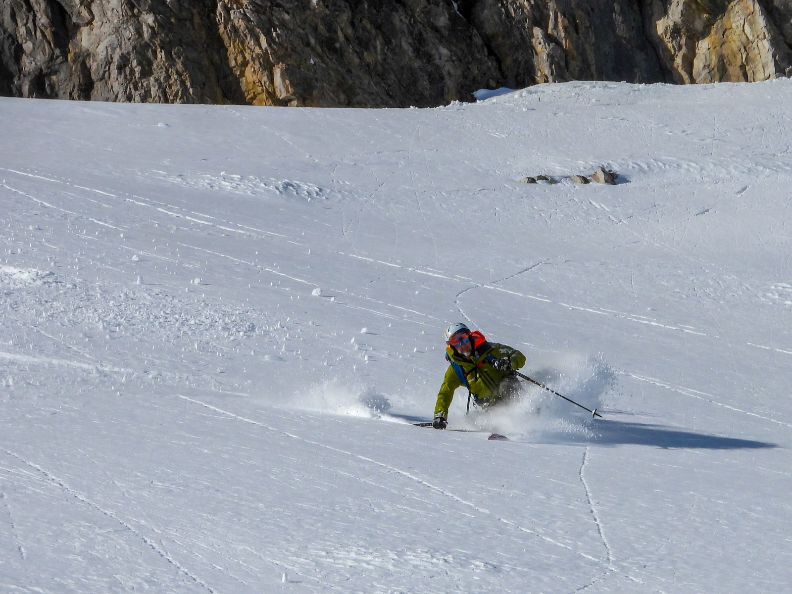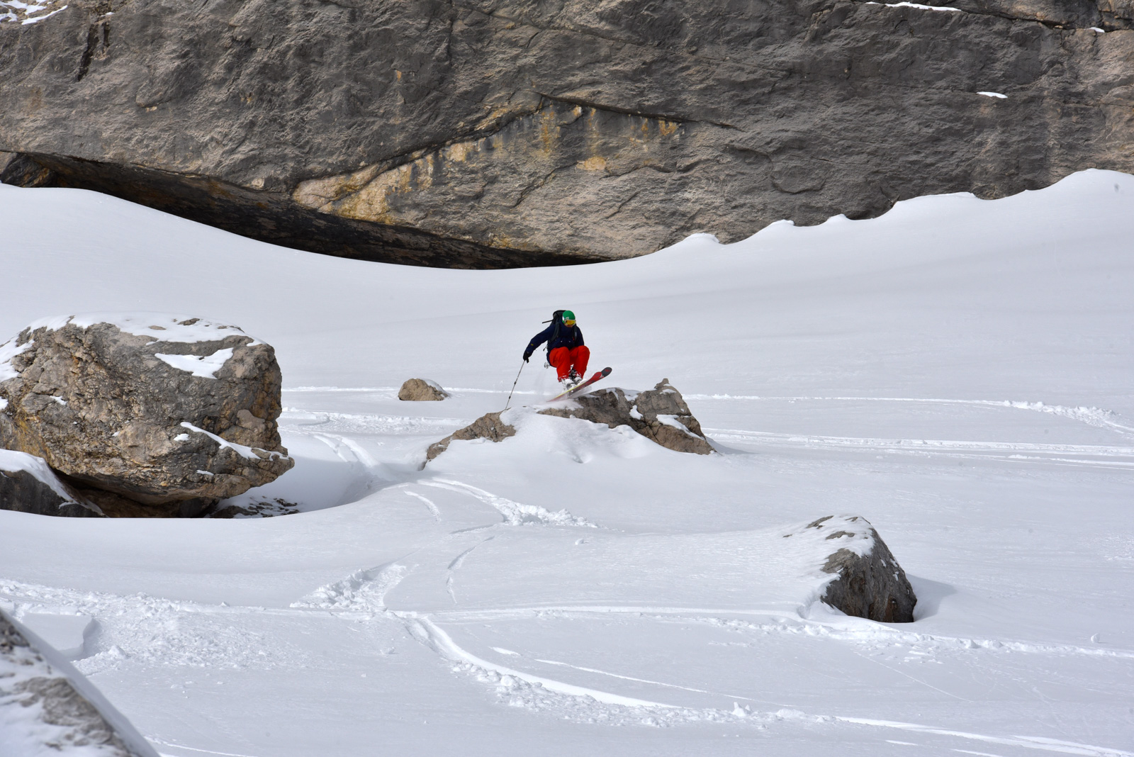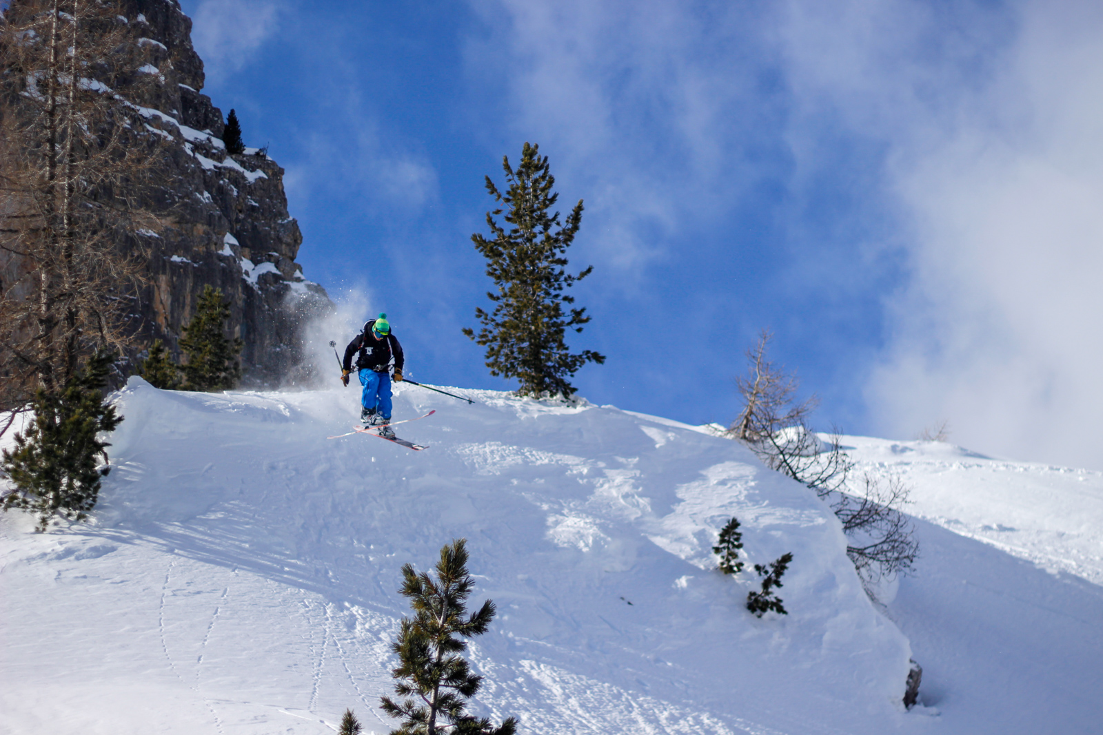 Samedi, dernière journée de ski dans les Dolomites, nous partons à 6h du matin pour admirer le lever du soleil derrière les montagnes. C’est notre «journée pachon». Il fait beau et chaud, une incroyable session, remplie de rires et de gamelles sur la piste. Nous terminons ainsi notre semaine italienne avec un dernier passage par le Bus de Tofana son couloir juste derrière et une halte au refuge d’Angelo Dibona.