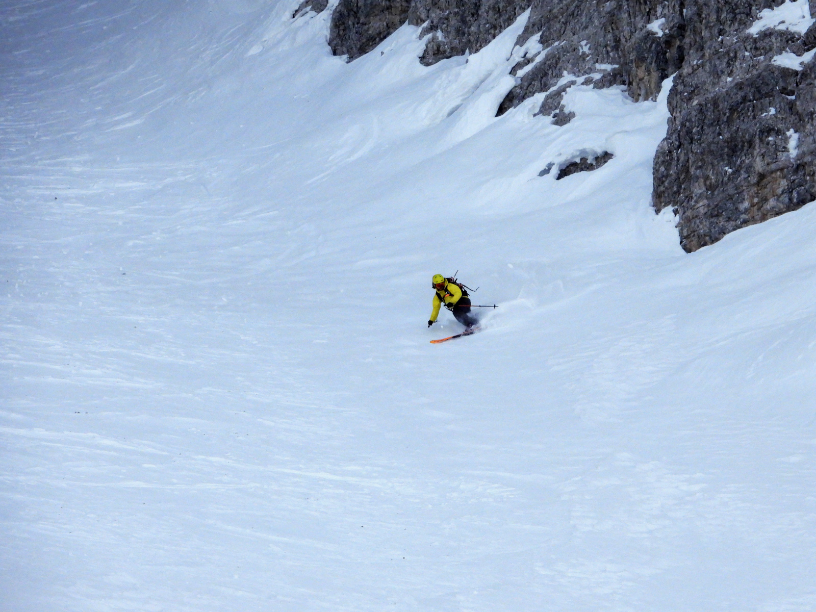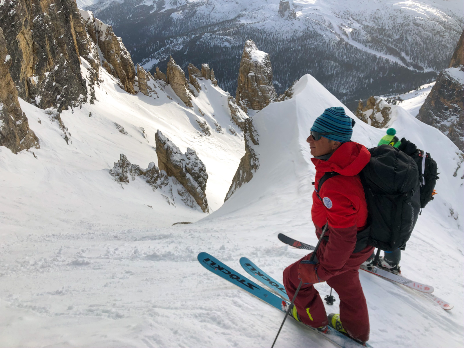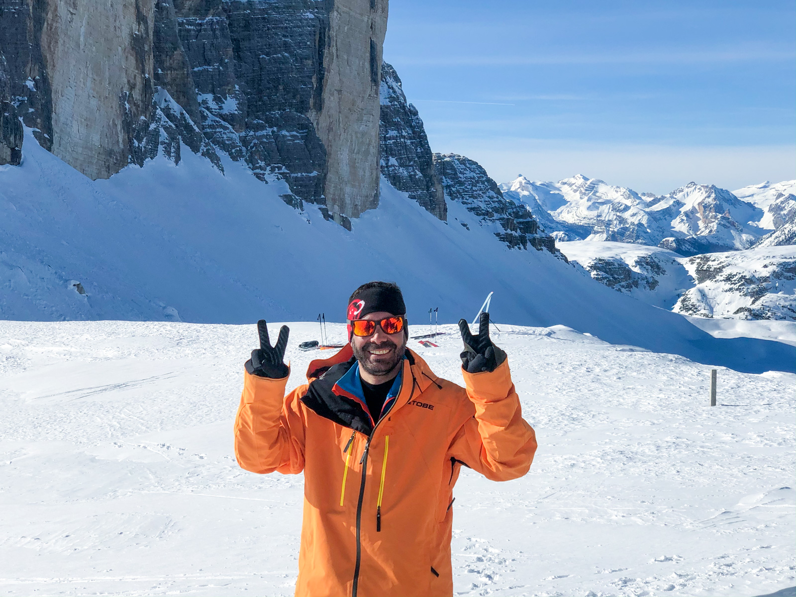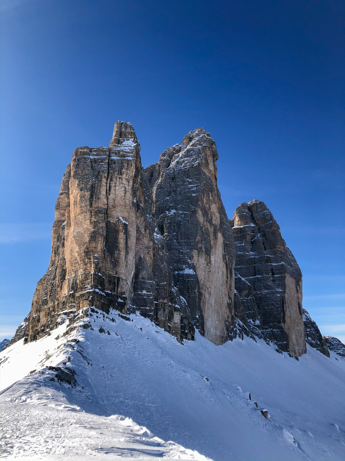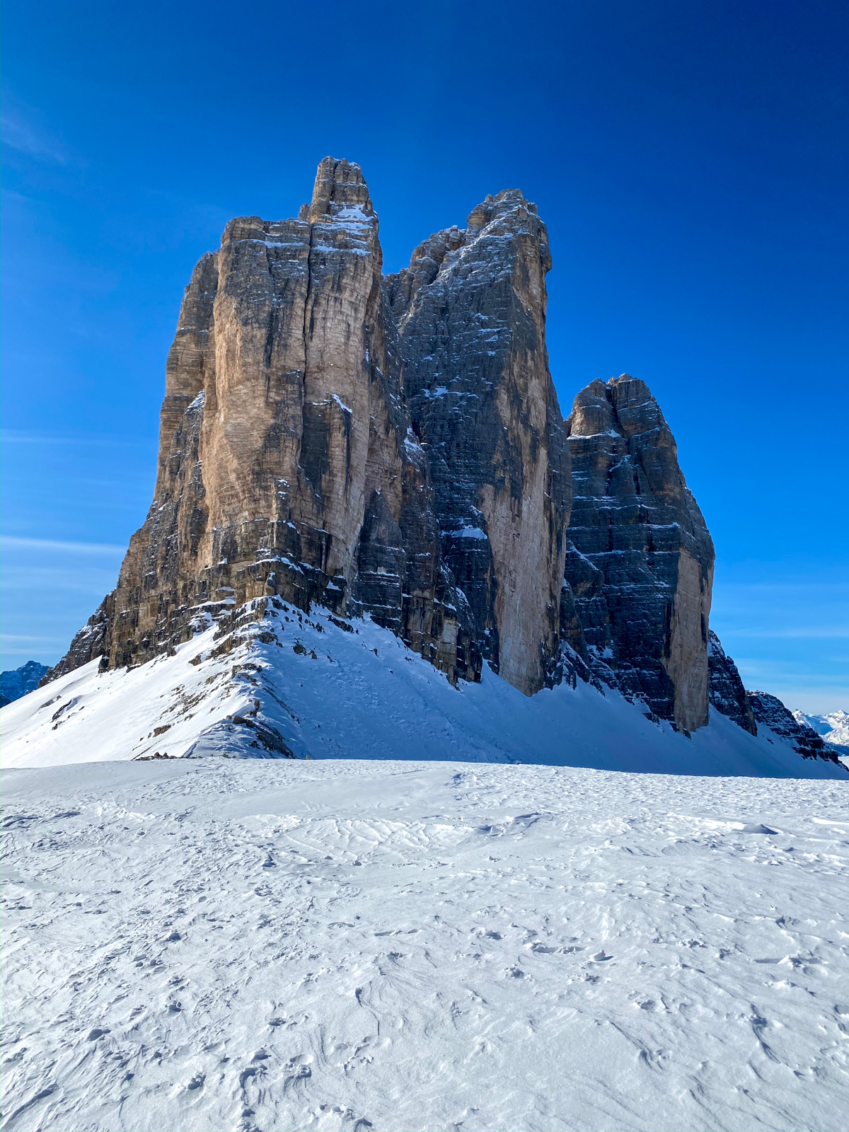 La fin de notre trip approche et notre guide nous réserve de belles surprises jusqu’au dernier jour. Rendez-vous donc à Lago d’Antorno, où des motos neiges nous attendent pour rejoindre le refuge d’Auronzo. Suivi d’une petite montée en peaux de phoque pour atteindre le col Forcella Lavaredo. Après une petite pente incroyablement parfaite, nous longeons les faces des Tre Cime di Lavaredo jusqu’au fameux troisième couloir (qui n’a pas de nom). Depuis le sommet, nous descendons alors toute la vallée jusqu’au Lago di Landro. Faire le tour de cette montagne nous aura pris toute la journée. L’épuisement se fait sentir…