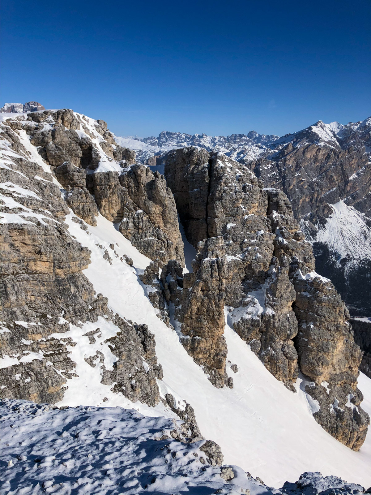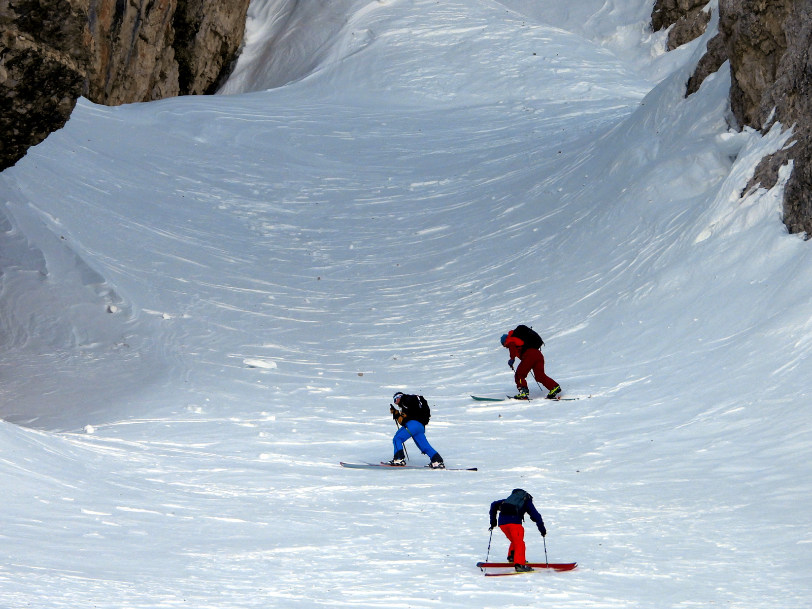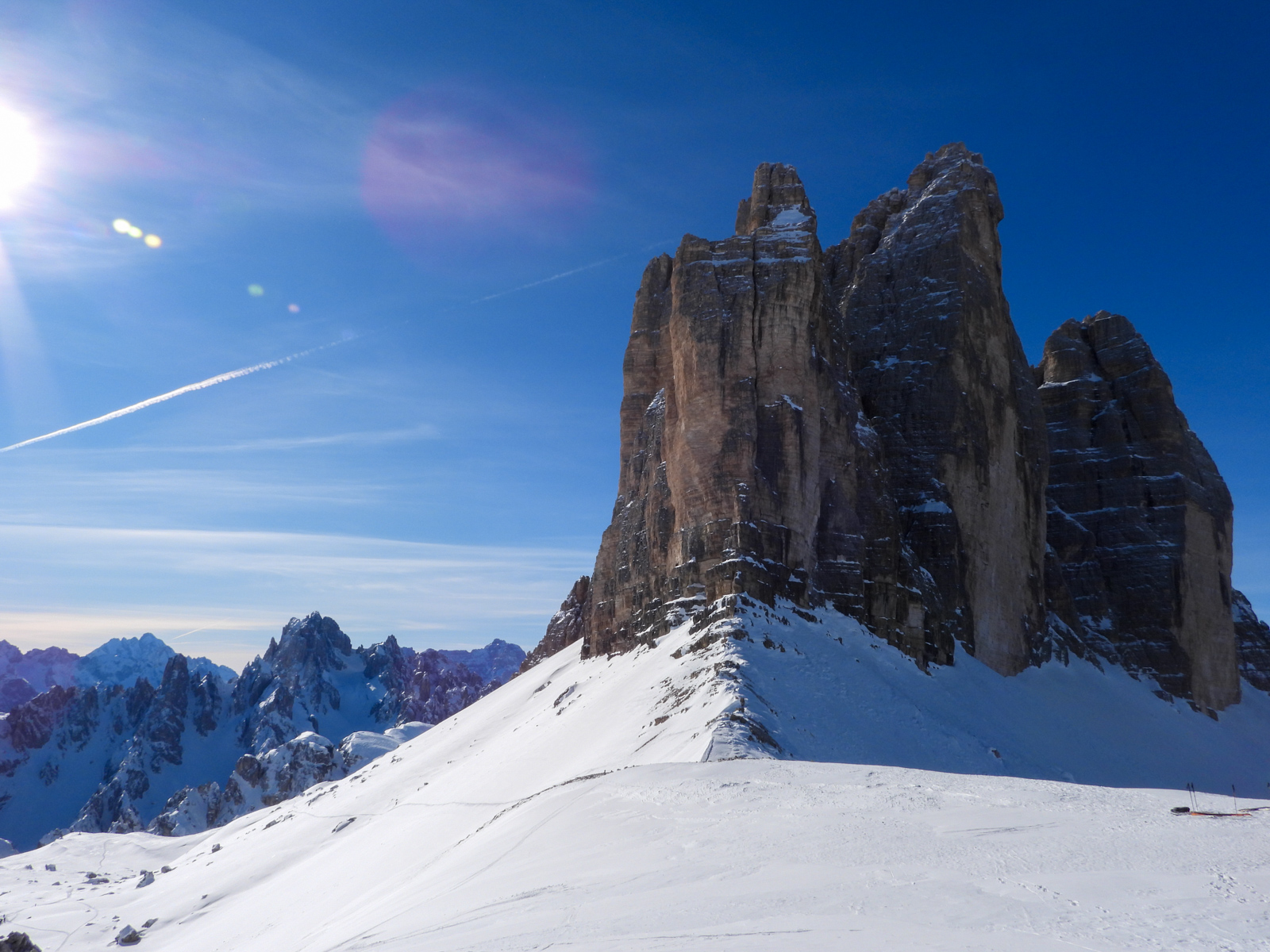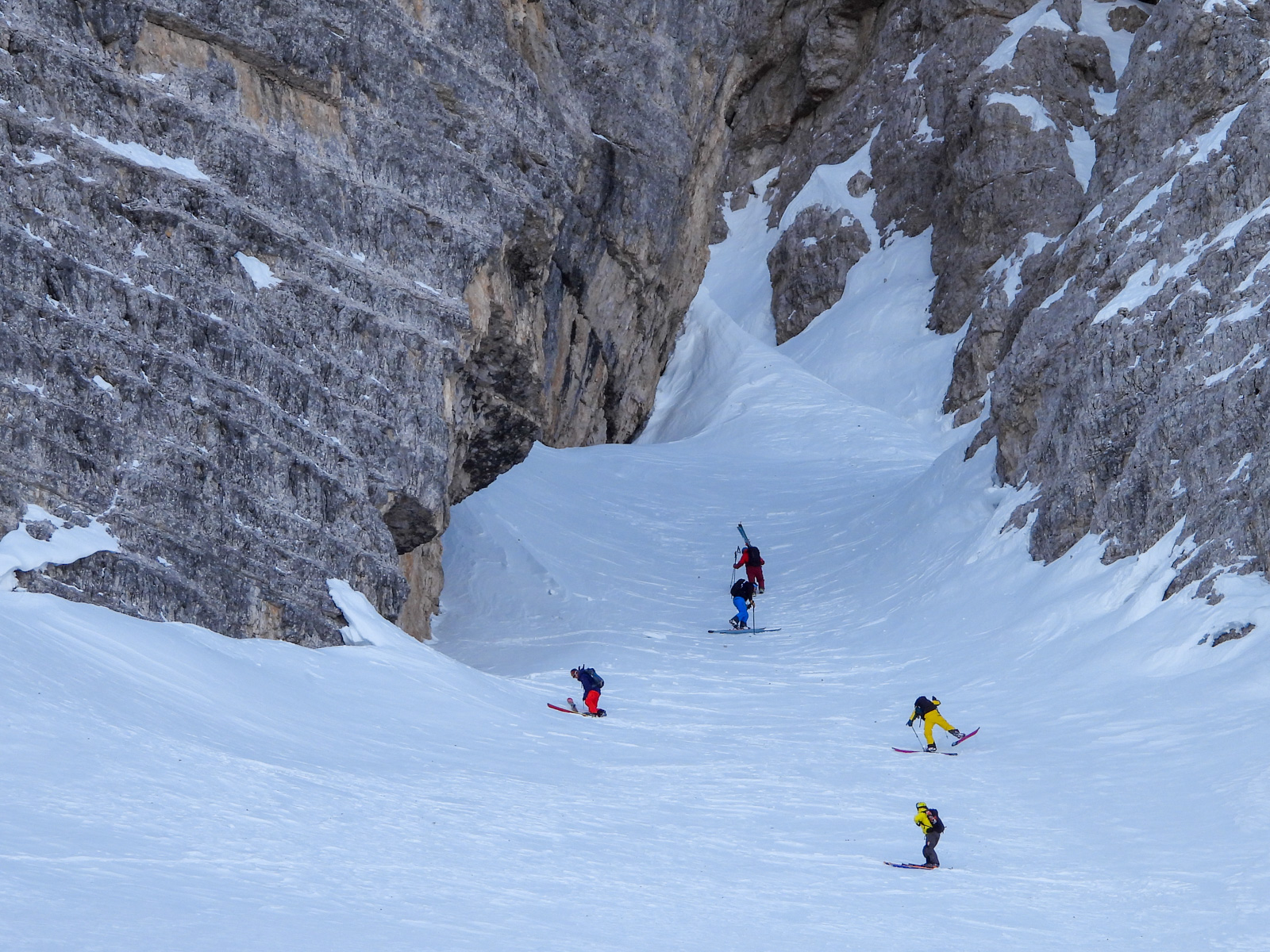 La fin de notre trip approche et notre guide nous réserve de belles surprises jusqu’au dernier jour. Rendez-vous donc à Lago d’Antorno, où des motos neiges nous attendent pour rejoindre le refuge d’Auronzo. Suivi d’une petite montée en peaux de phoque pour atteindre le col Forcella Lavaredo. Après une petite pente incroyablement parfaite, nous longeons les faces des Tre Cime di Lavaredo jusqu’au fameux troisième couloir (qui n’a pas de nom). Depuis le sommet, nous descendons alors toute la vallée jusqu’au Lago di Landro. Faire le tour de cette montagne nous aura pris toute la journée. L’épuisement se fait sentir…