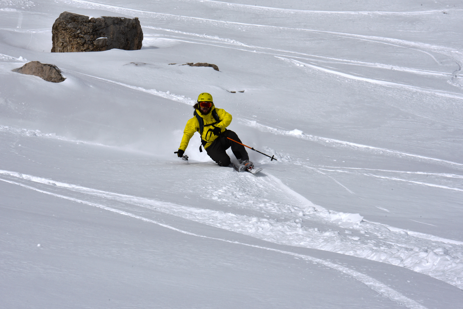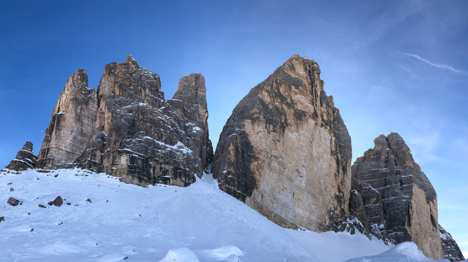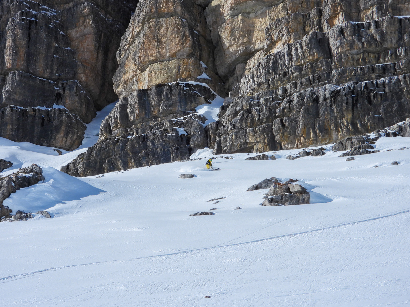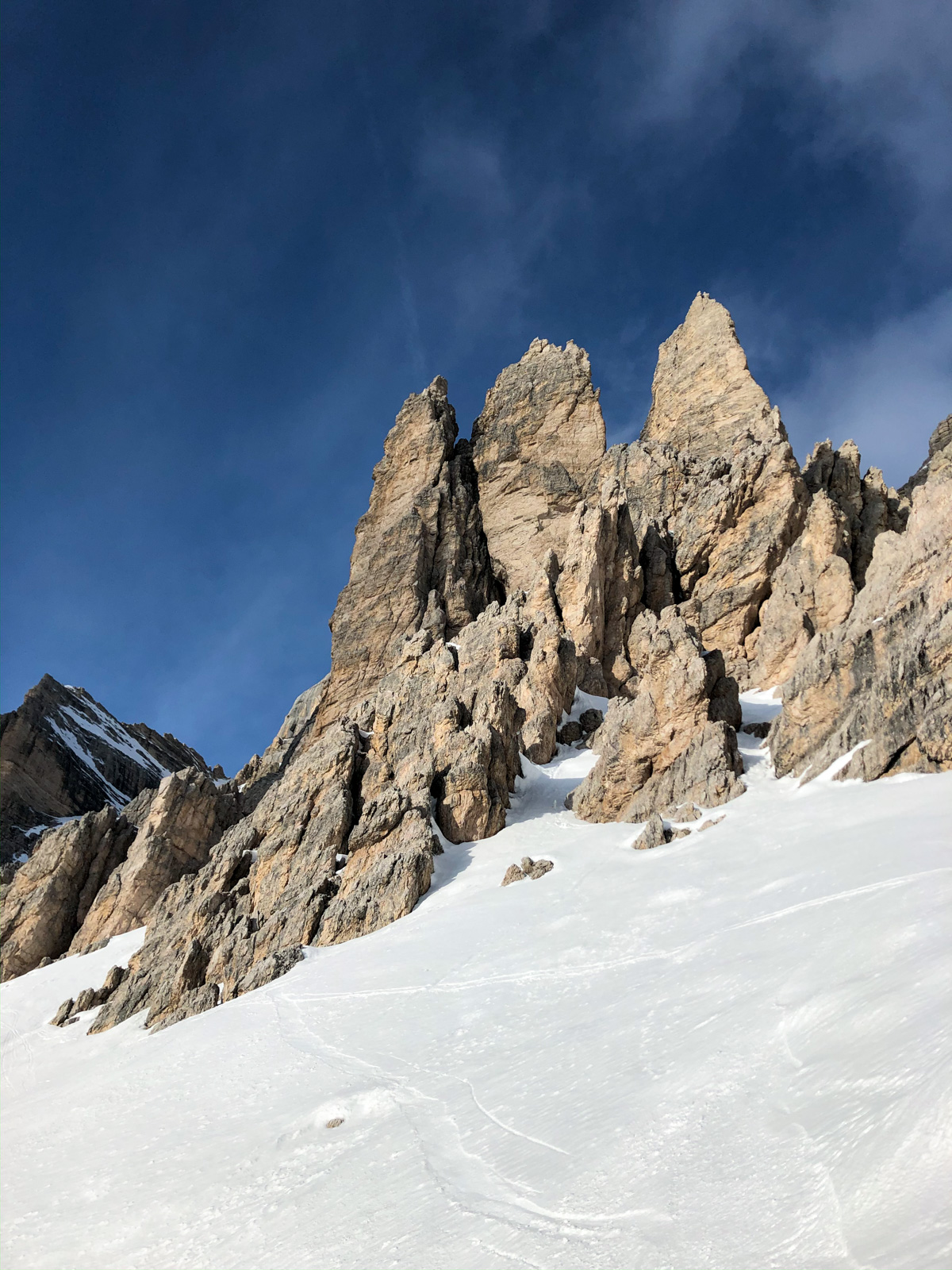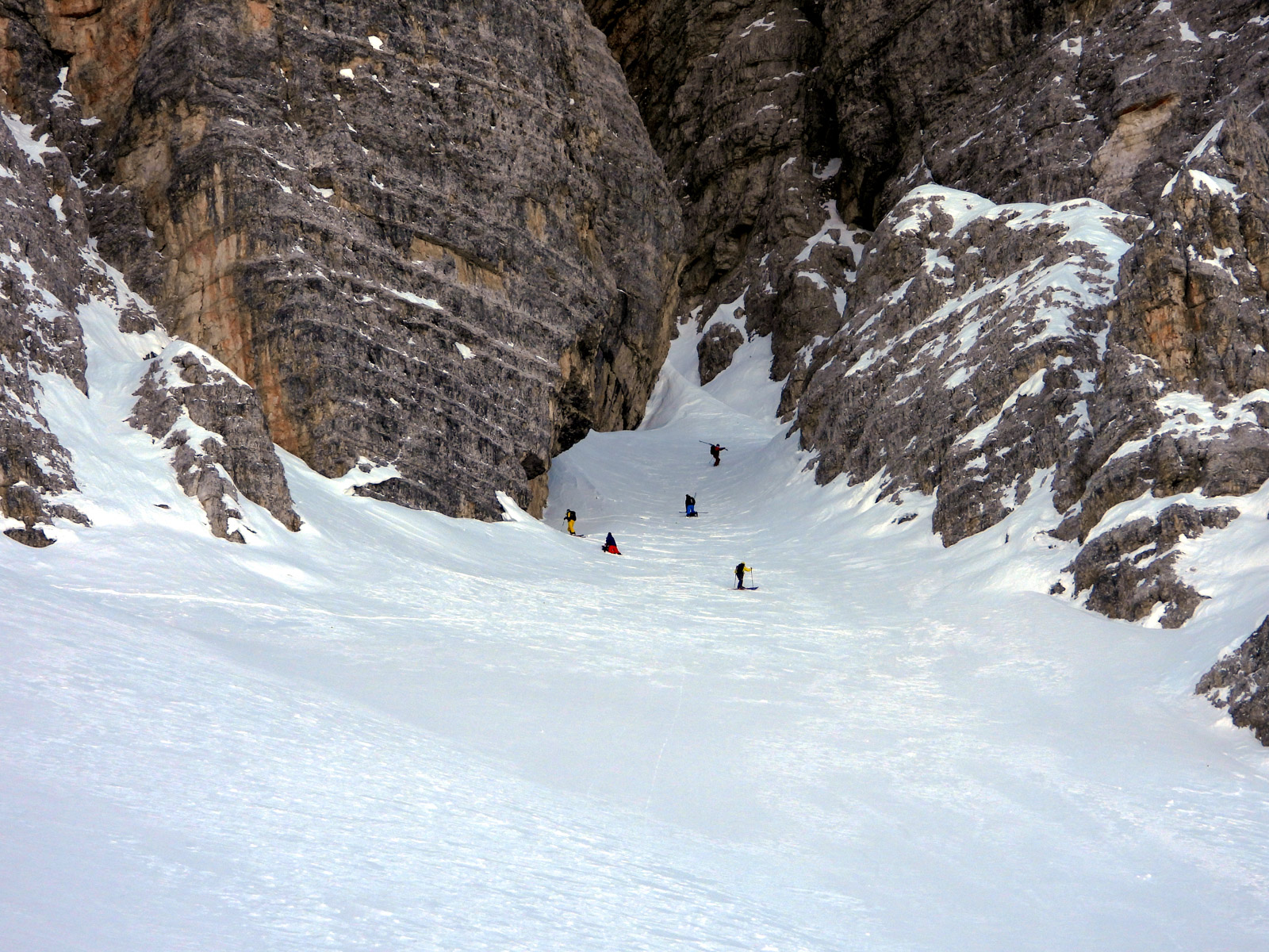 La fin de notre trip approche et notre guide nous réserve de belles surprises jusqu’au dernier jour. Rendez-vous donc à Lago d’Antorno, où des motos neiges nous attendent pour rejoindre le refuge d’Auronzo. Suivi d’une petite montée en peaux de phoque pour atteindre le col Forcella Lavaredo. Après une petite pente incroyablement parfaite, nous longeons les faces des Tre Cime di Lavaredo jusqu’au fameux troisième couloir (qui n’a pas de nom). Depuis le sommet, nous descendons alors toute la vallée jusqu’au Lago di Landro. Faire le tour de cette montagne nous aura pris toute la journée. L’épuisement se fait sentir…