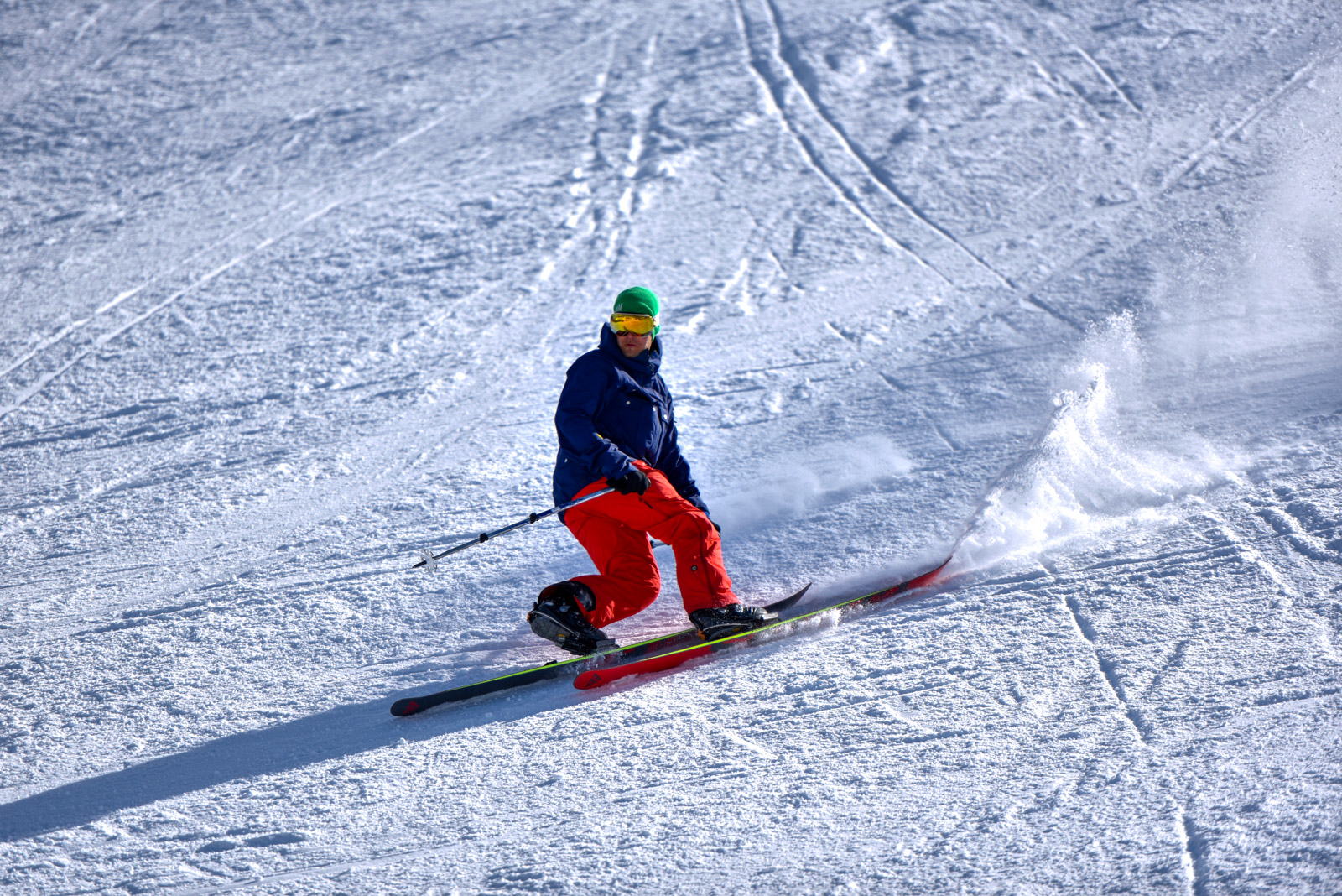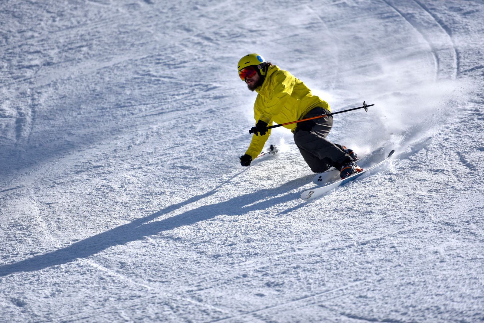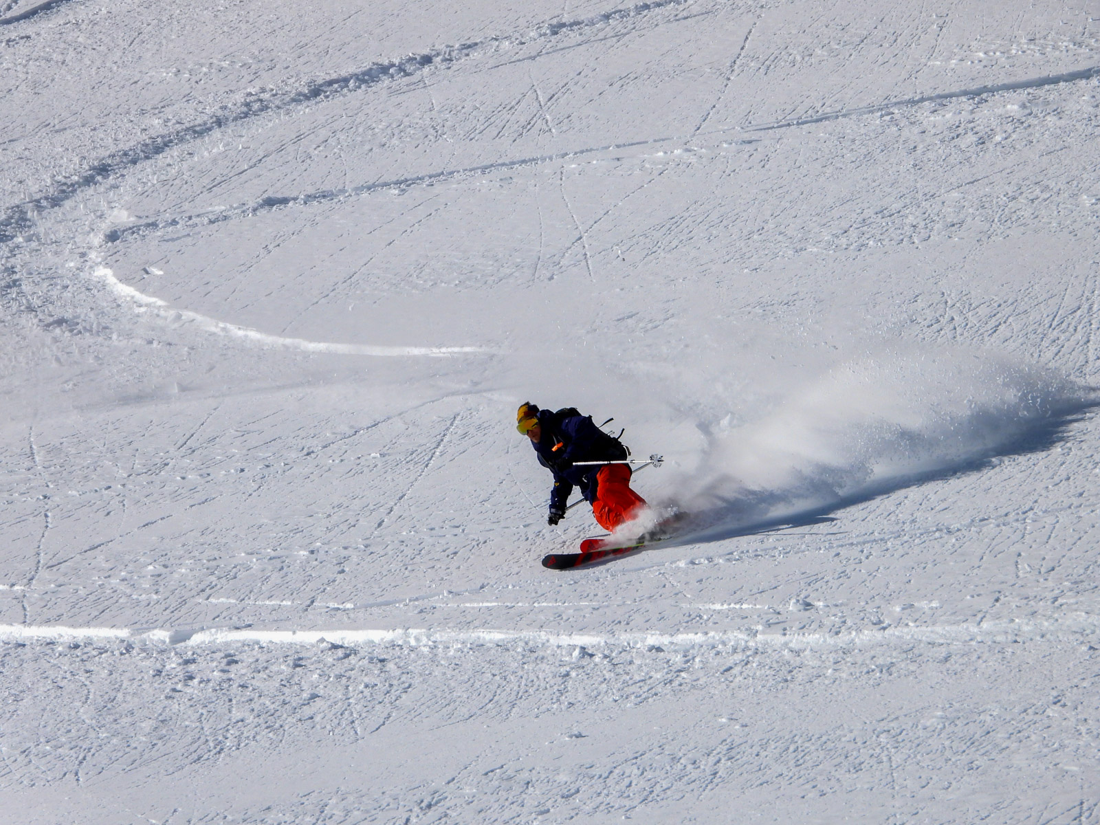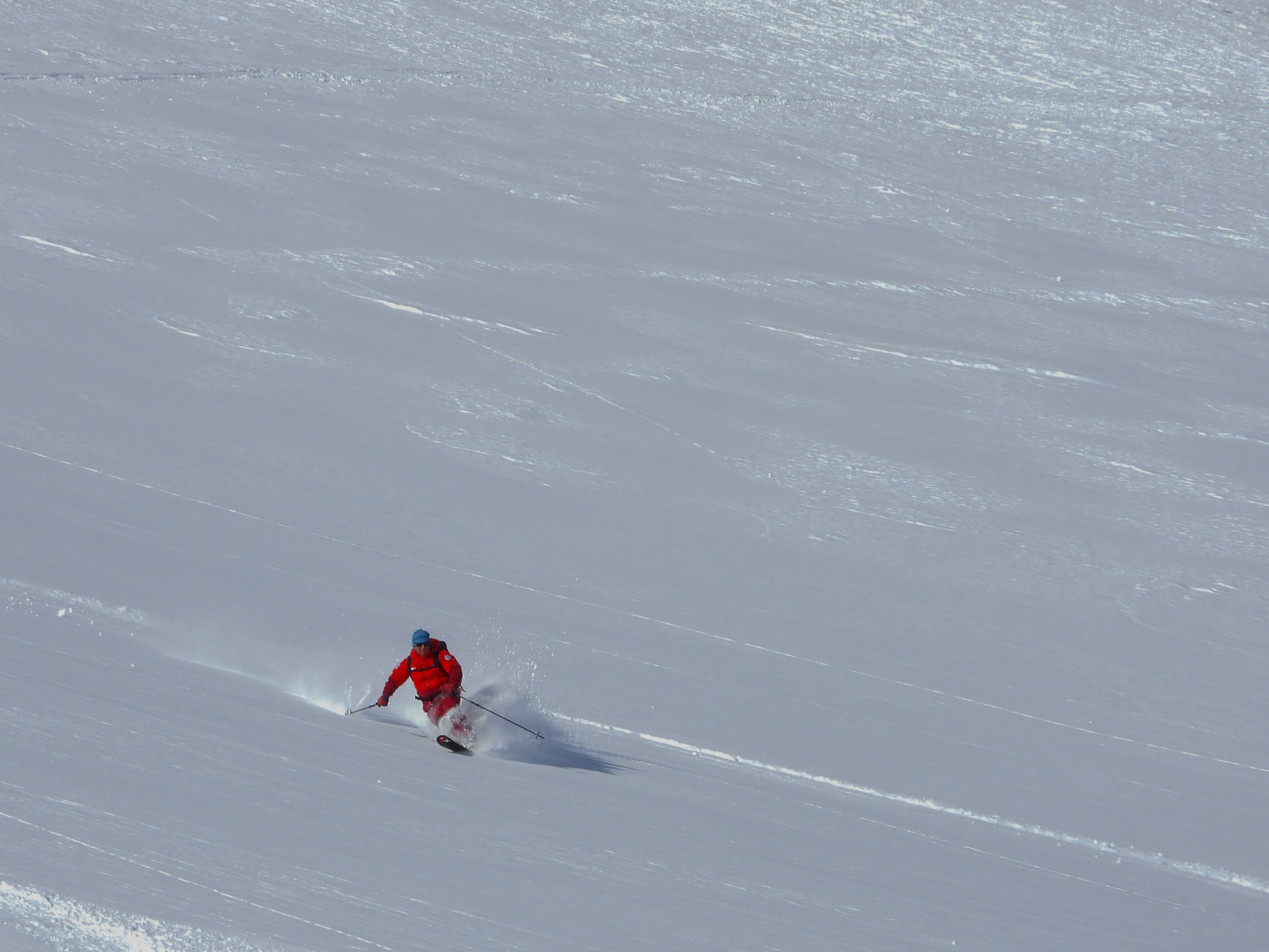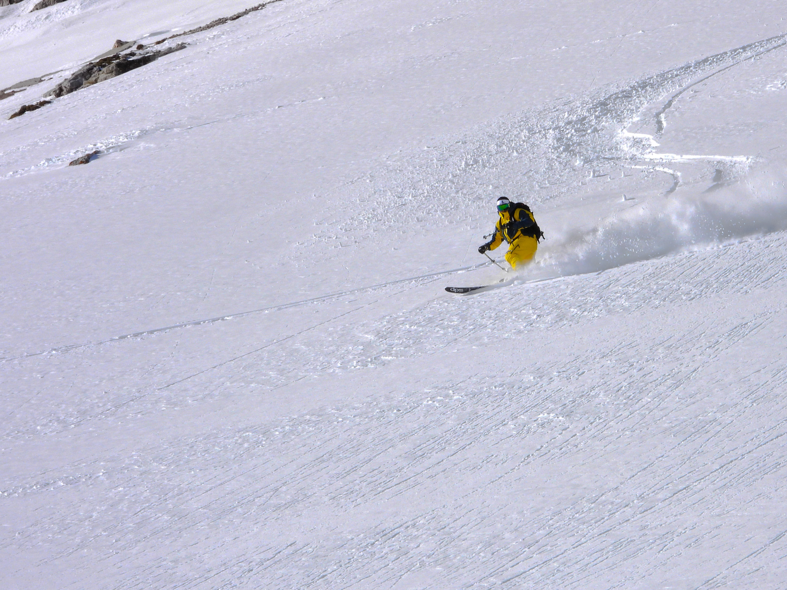 La fin de notre trip approche et notre guide nous réserve de belles surprises jusqu’au dernier jour. Rendez-vous donc à Lago d’Antorno, où des motos neiges nous attendent pour rejoindre le refuge d’Auronzo. Suivi d’une petite montée en peaux de phoque pour atteindre le col Forcella Lavaredo. Après une petite pente incroyablement parfaite, nous longeons les faces des Tre Cime di Lavaredo jusqu’au fameux troisième couloir (qui n’a pas de nom). Depuis le sommet, nous descendons alors toute la vallée jusqu’au Lago di Landro. Faire le tour de cette montagne nous aura pris toute la journée. L’épuisement se fait sentir…