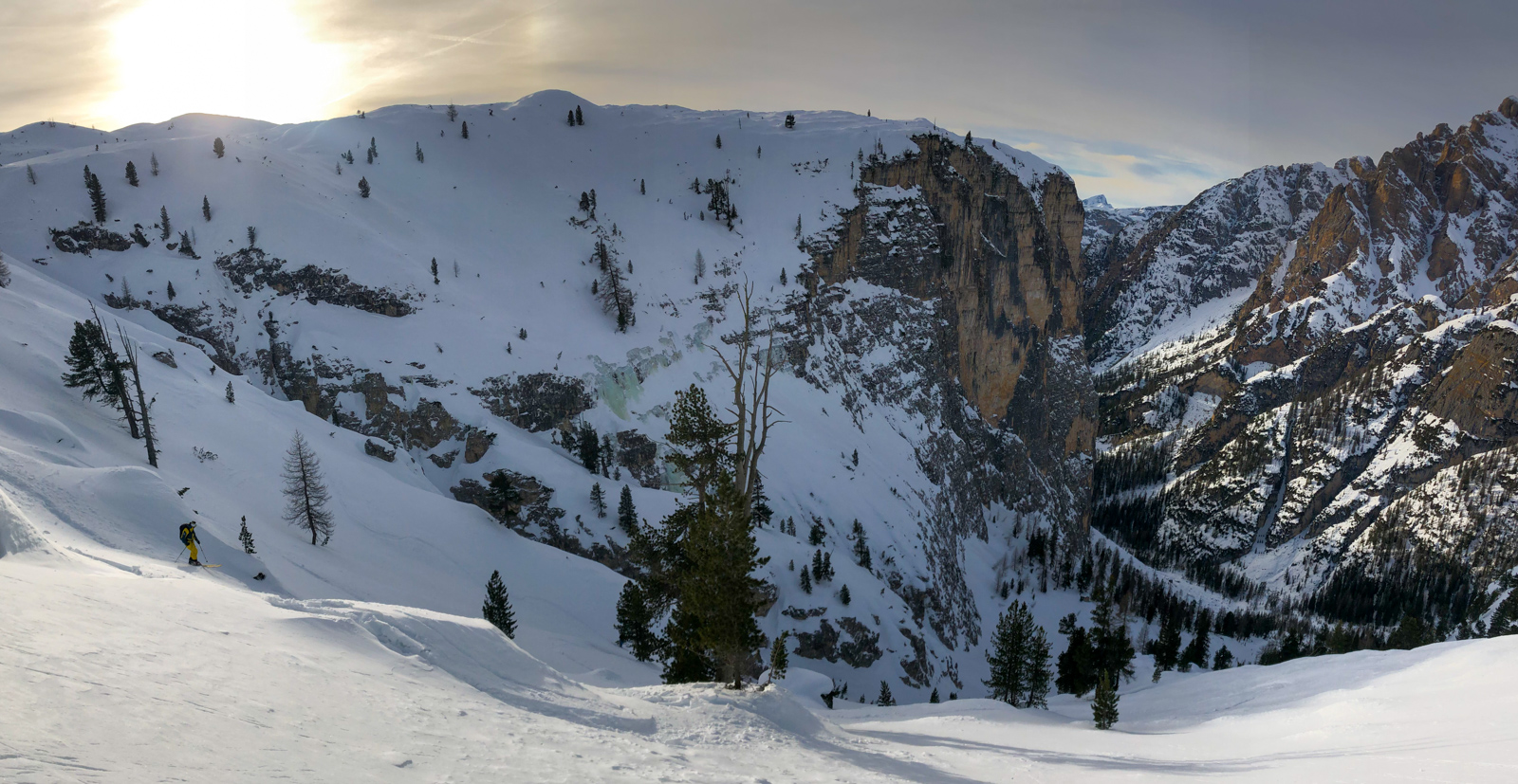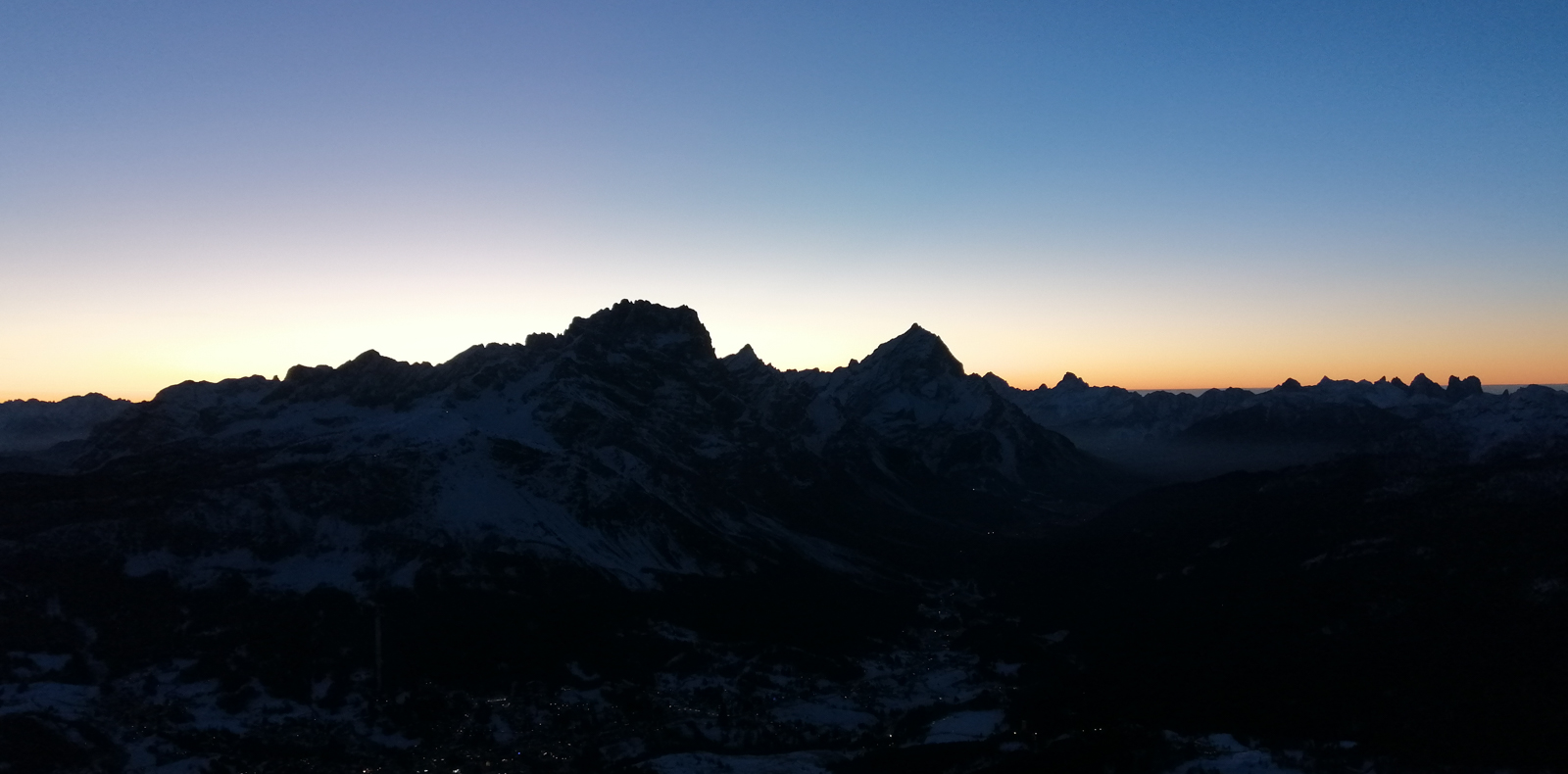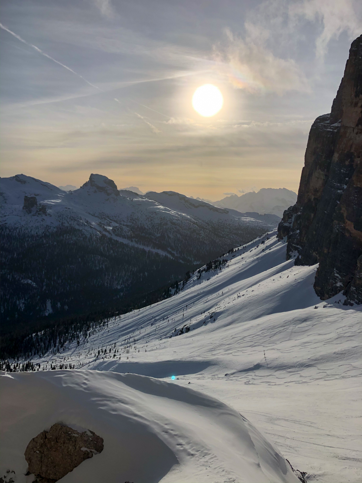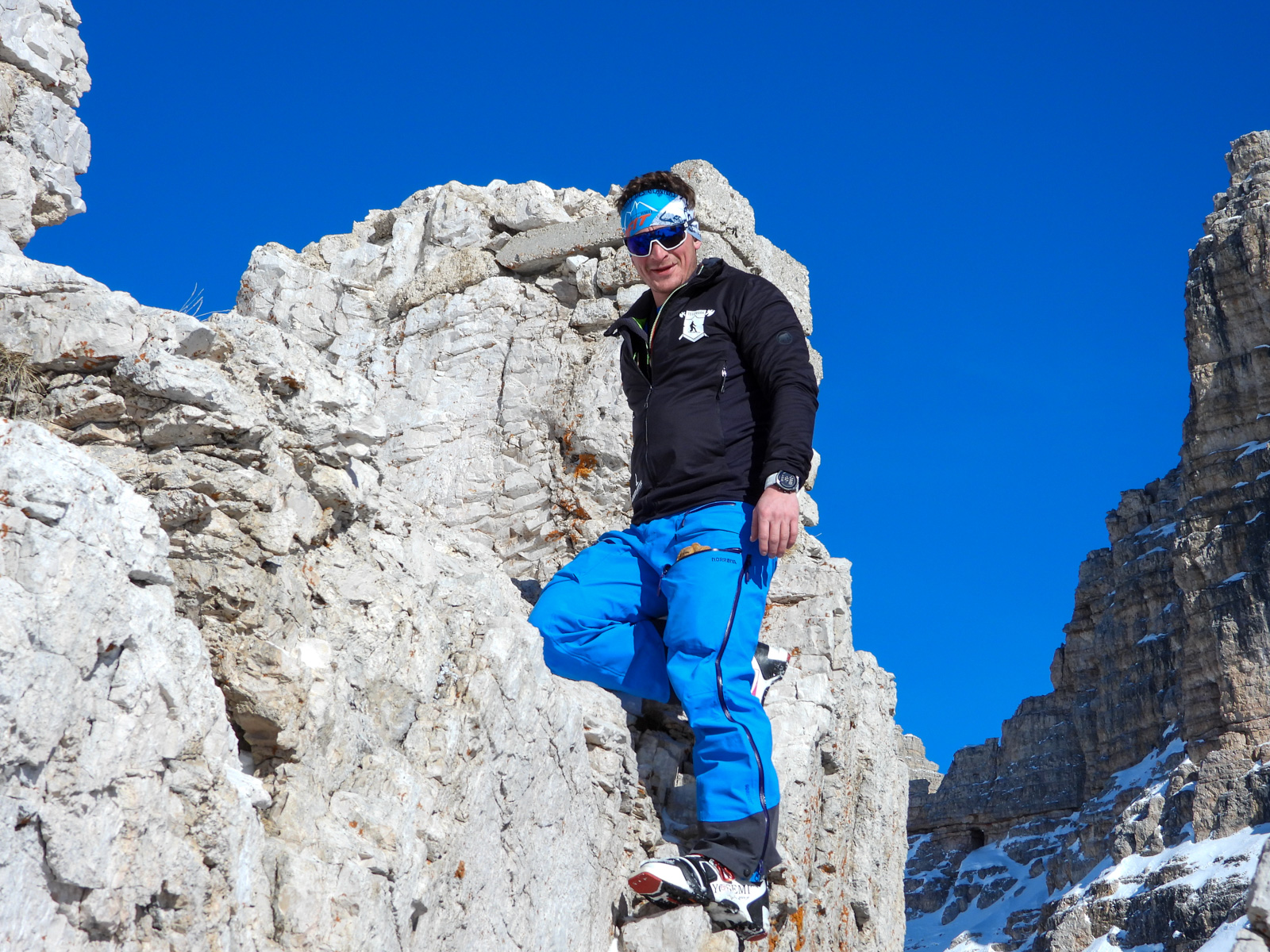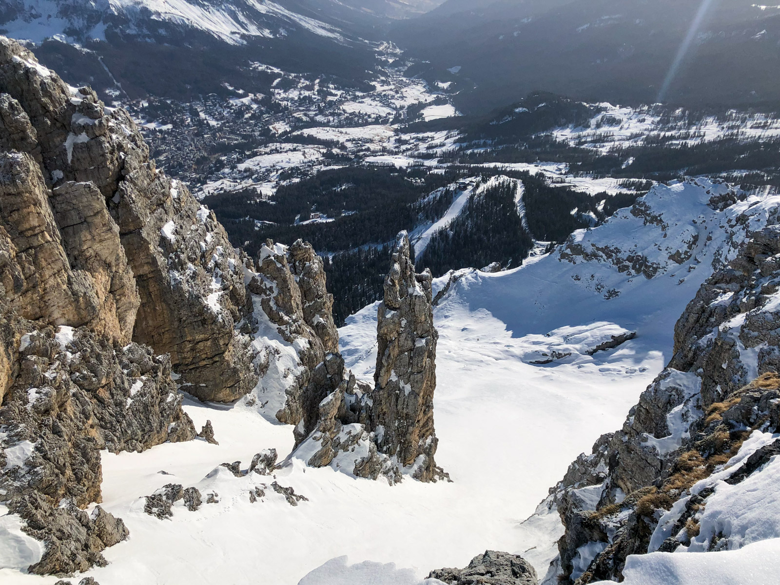 Morgins, 25 janvier 2020, 5h30. Nous chargeons la voiture, il y en a du matériel. Et c’est parti pour un trip routier de 10h, destination Cortina d’Ampezzo dans les Dolomites en Italie. Nous sommes tous les 7 dans la voiture, ça va être long. Après quelques pauses et quelques changements de pilote, nous arrivons dans la station le soir, et rencontrons notre guide Paolo Tassi, lui aussi télémarkeur. La semaine est lancée!