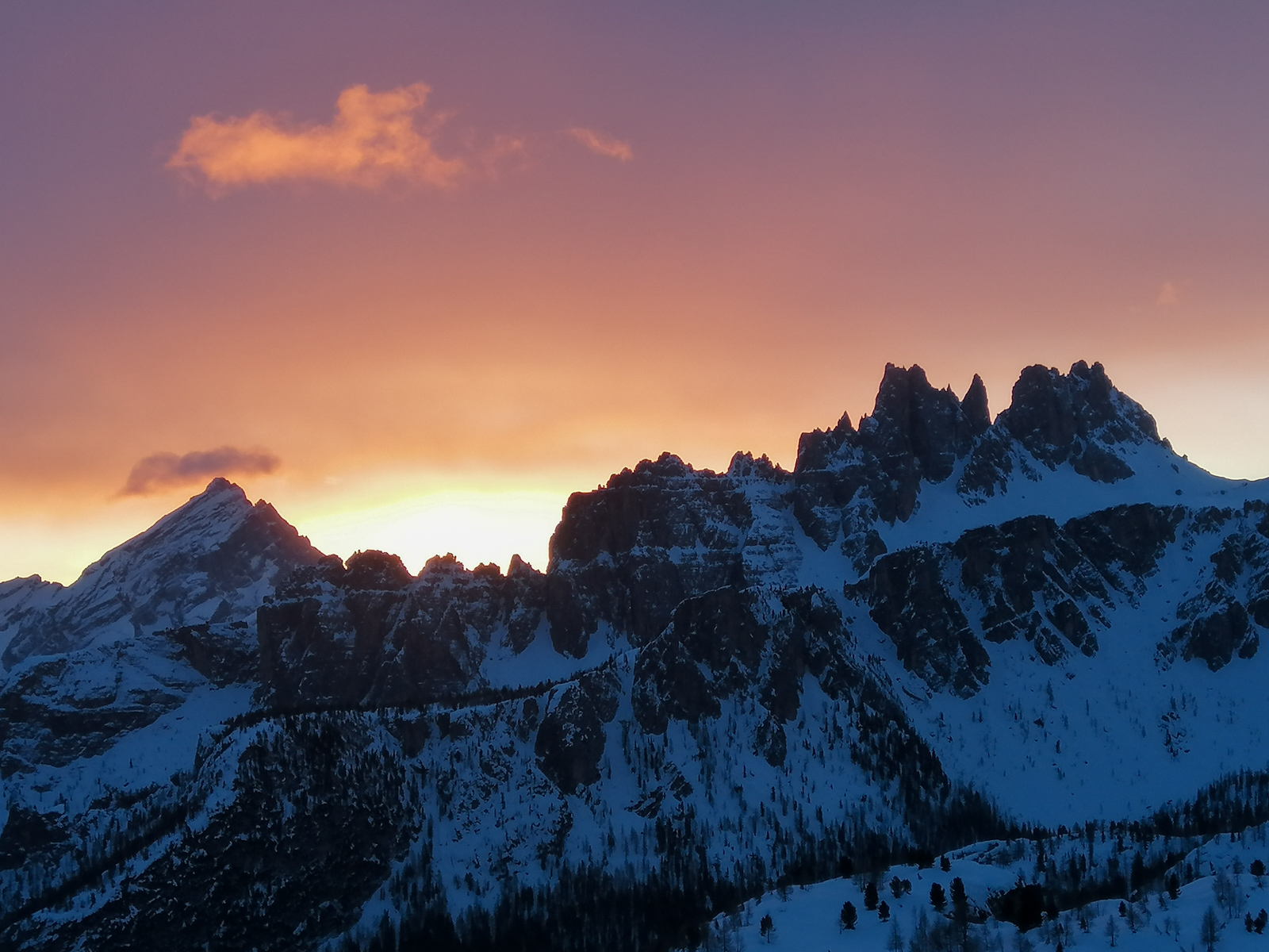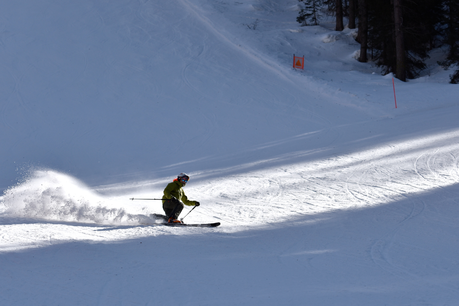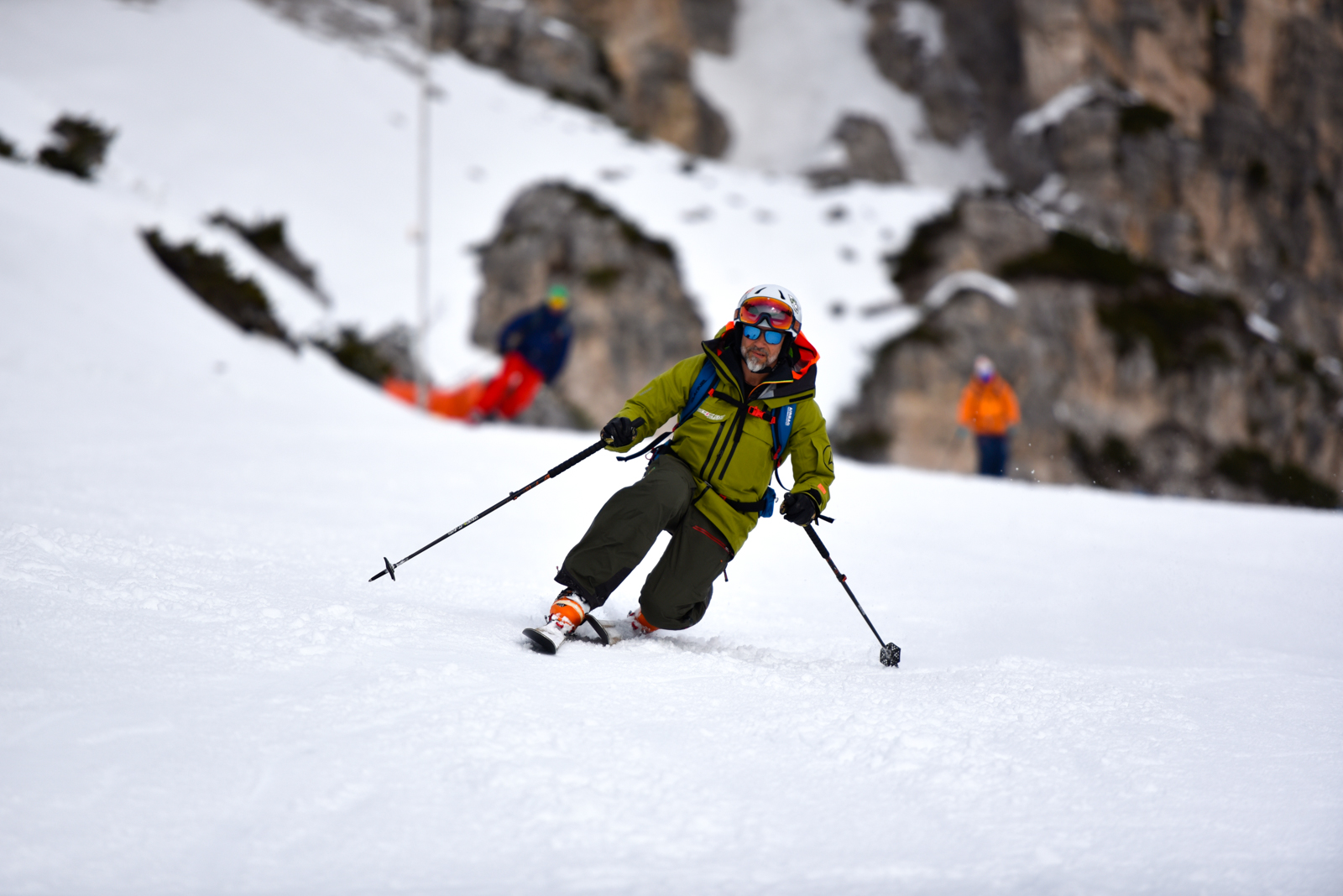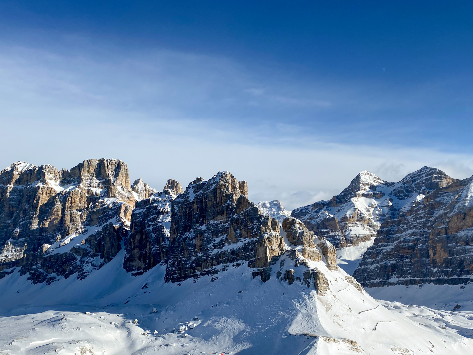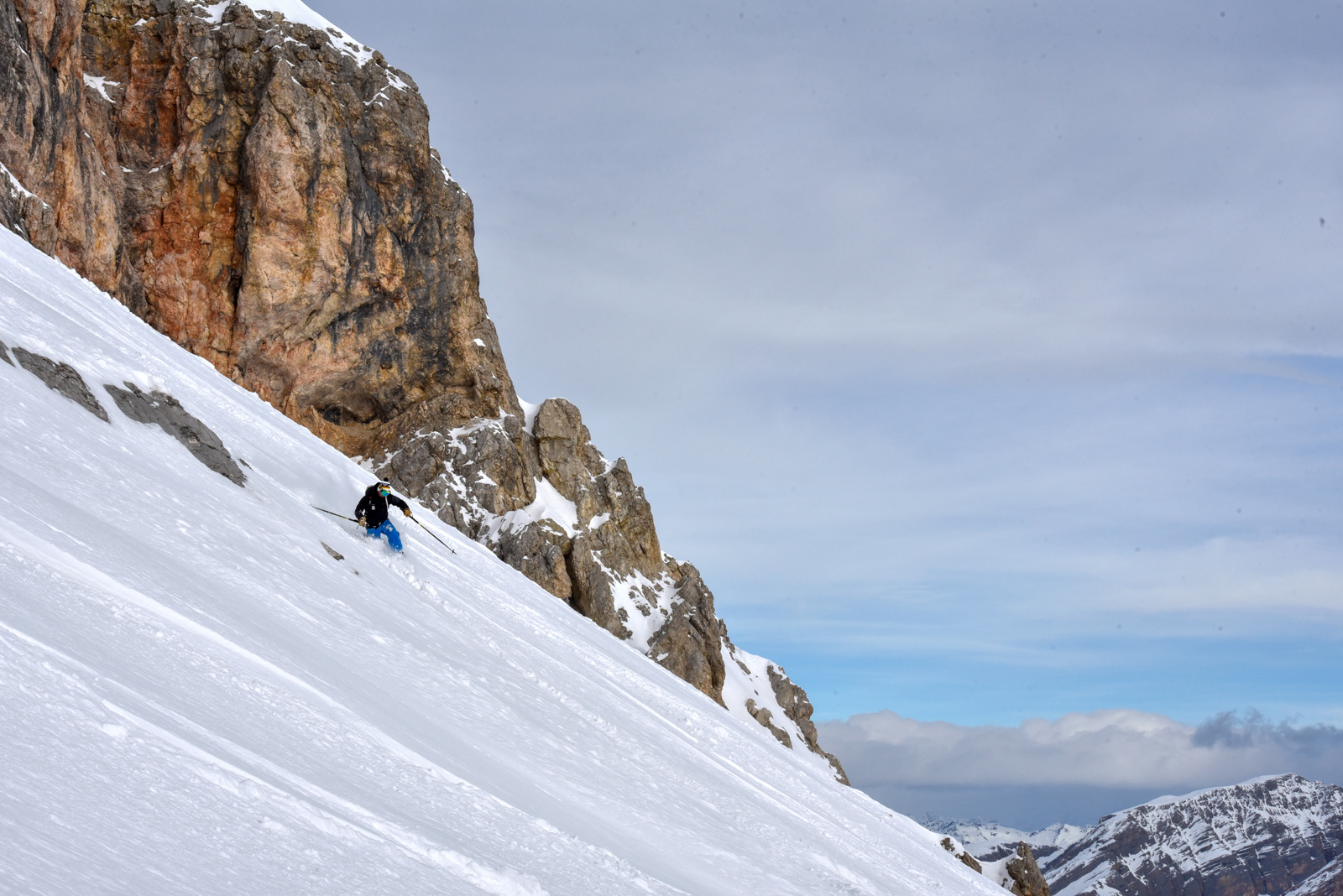 Morgins, 25 janvier 2020, 5h30. Nous chargeons la voiture, il y en a du matériel. Et c’est parti pour un trip routier de 10h, destination Cortina d’Ampezzo dans les Dolomites en Italie. Nous sommes tous les 7 dans la voiture, ça va être long. Après quelques pauses et quelques changements de pilote, nous arrivons dans la station le soir, et rencontrons notre guide Paolo Tassi, lui aussi télémarkeur. La semaine est lancée!