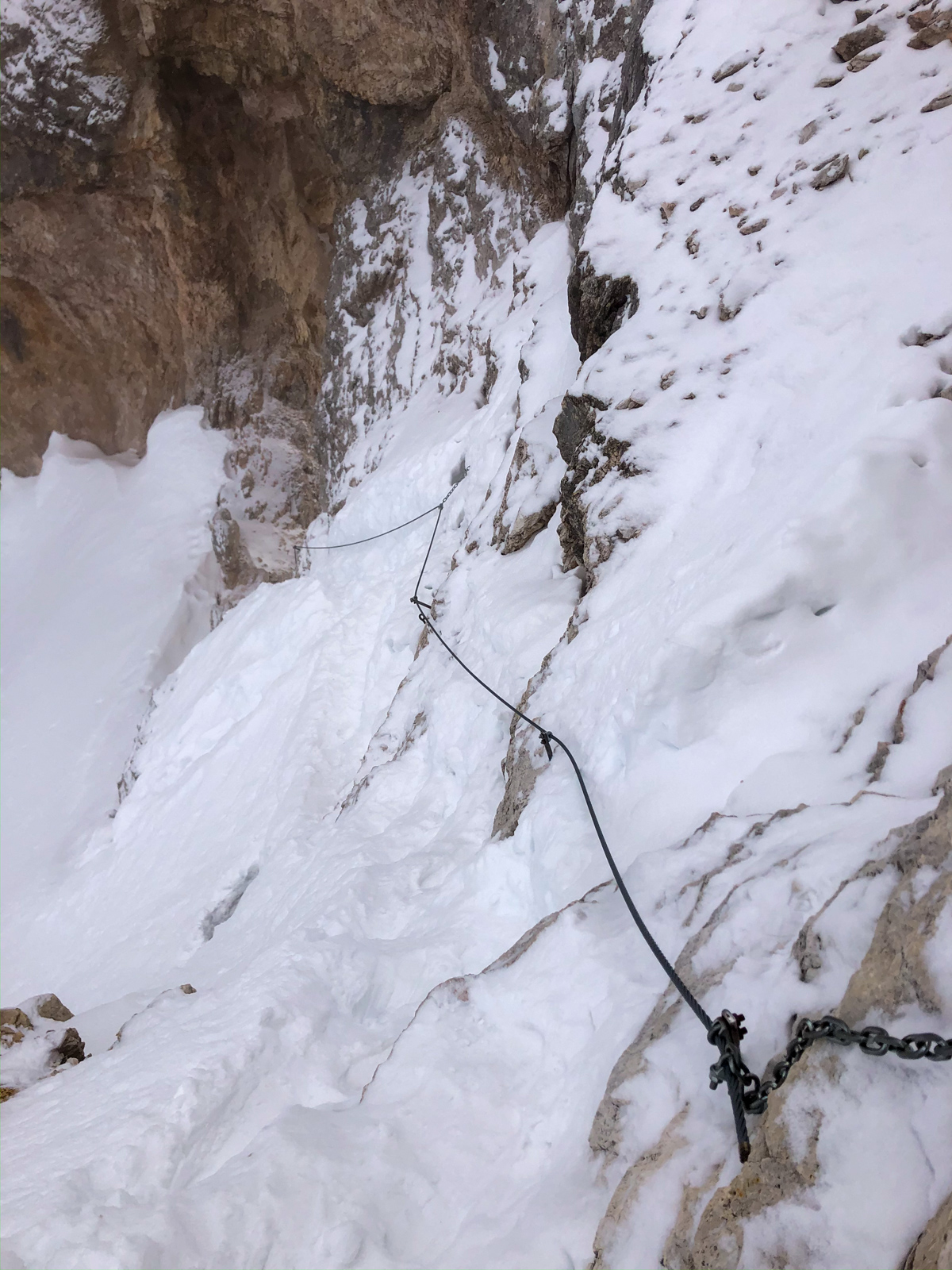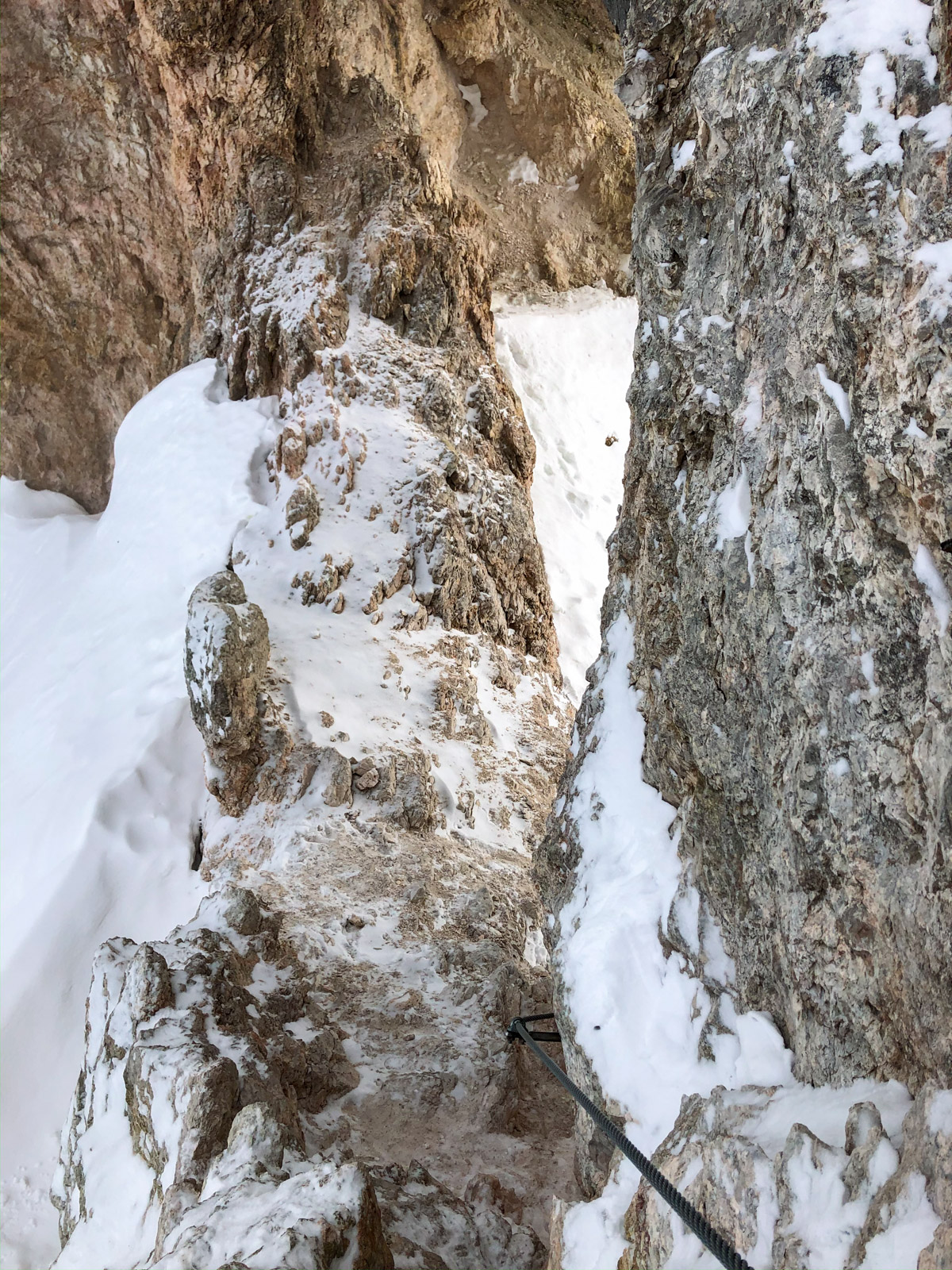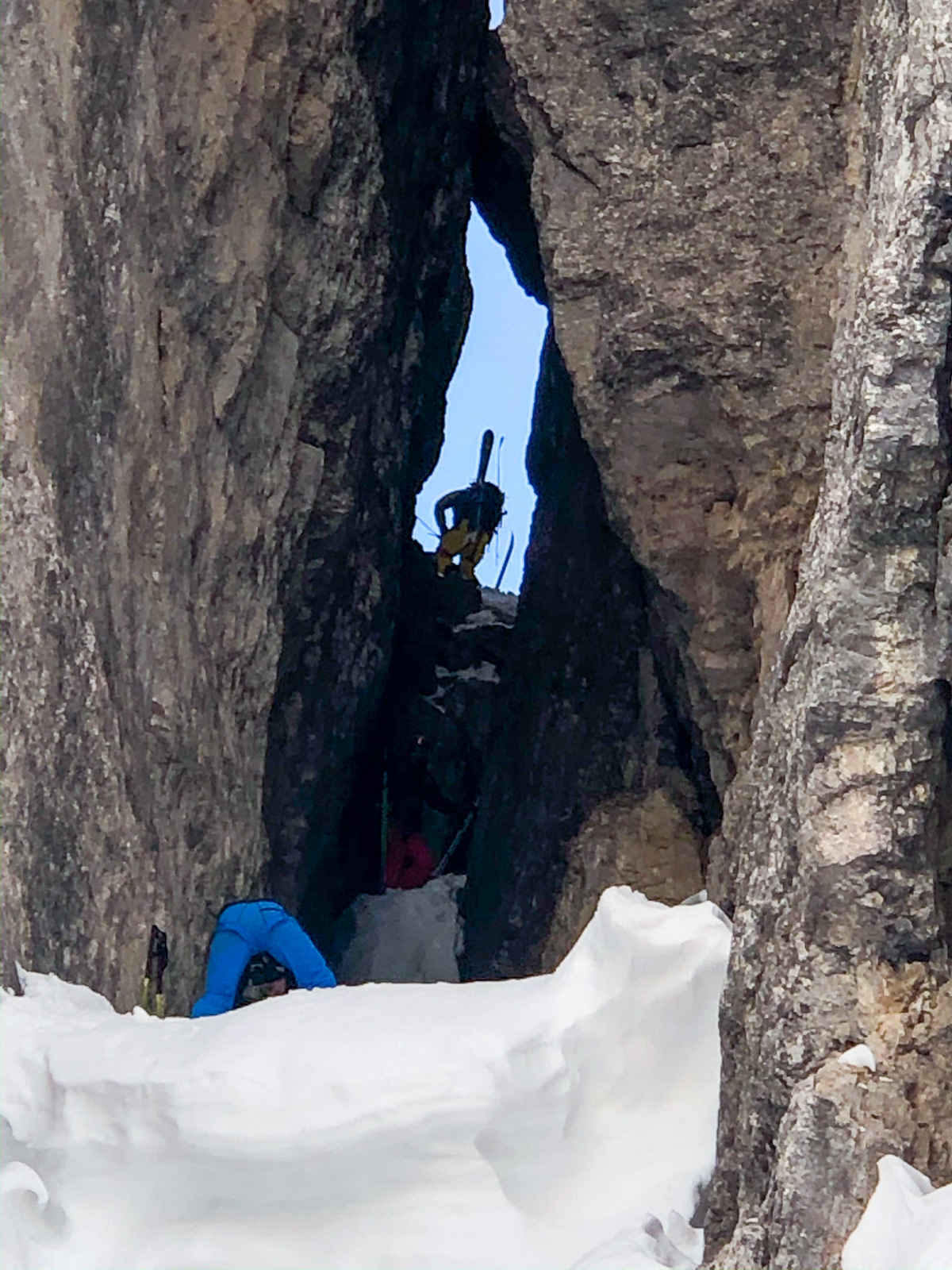 Nous voyageons ainsi dans les vallées voisines grâce au soutien de l’office du tourisme et aux connaissances de Paolo. Les pauses sont courtes, les sorties intenses, la machine à souvenirs est en marche avec le mythique passage du Bus de Tofana, le couloir de la bougie, auxquels nous accédons soit en crampons, soit en via ferrata. Nous quittons clairement notre zone de confort, c’est une première pour toute l’équipe.