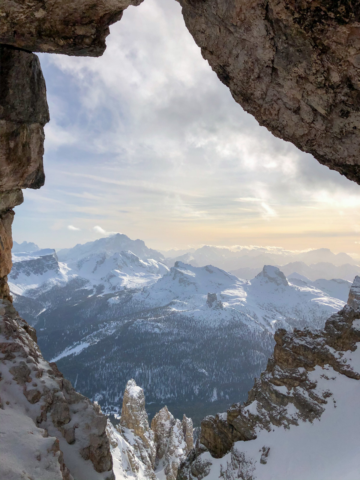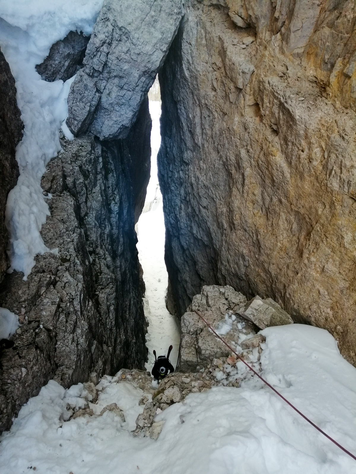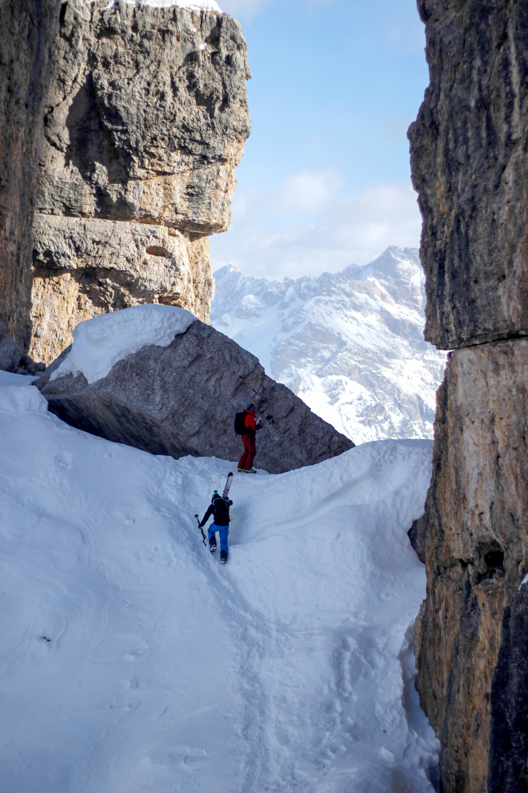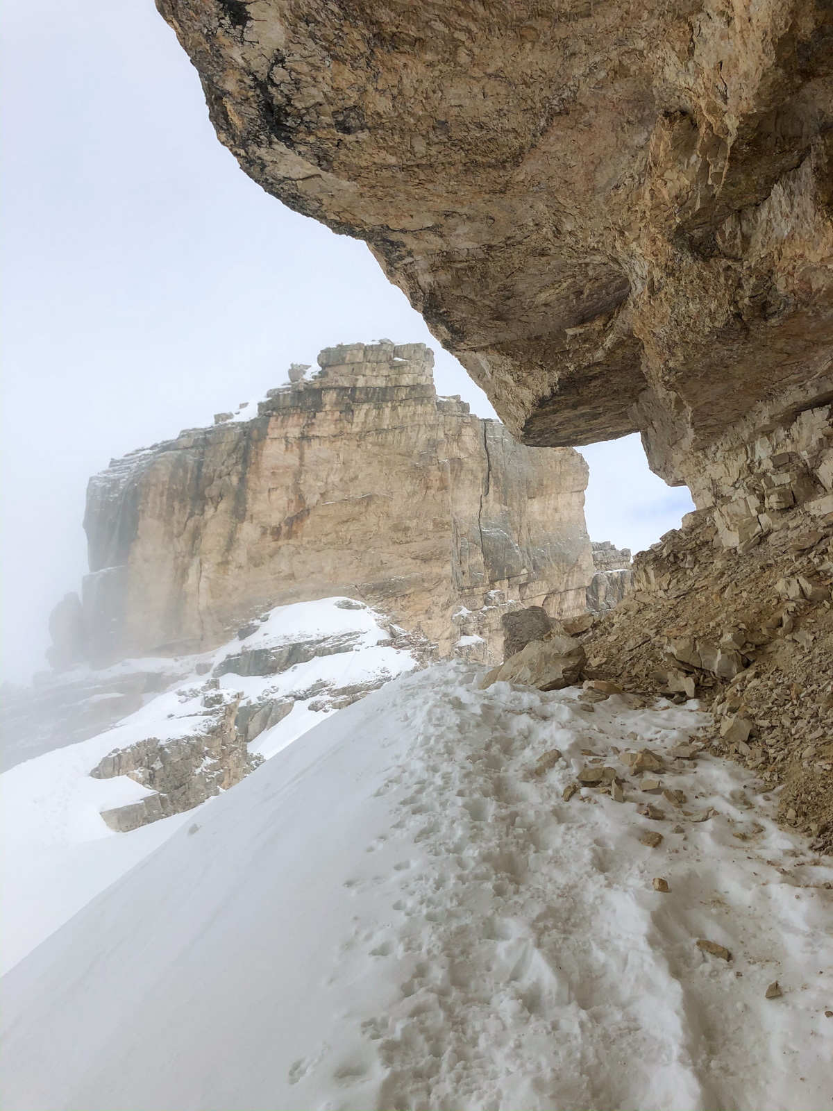 Nous voyageons ainsi dans les vallées voisines grâce au soutien de l’office du tourisme et aux connaissances de Paolo. Les pauses sont courtes, les sorties intenses, la machine à souvenirs est en marche avec le mythique passage du Bus de Tofana, le couloir de la bougie, auxquels nous accédons soit en crampons, soit en via ferrata. Nous quittons clairement notre zone de confort, c’est une première pour toute l’équipe.