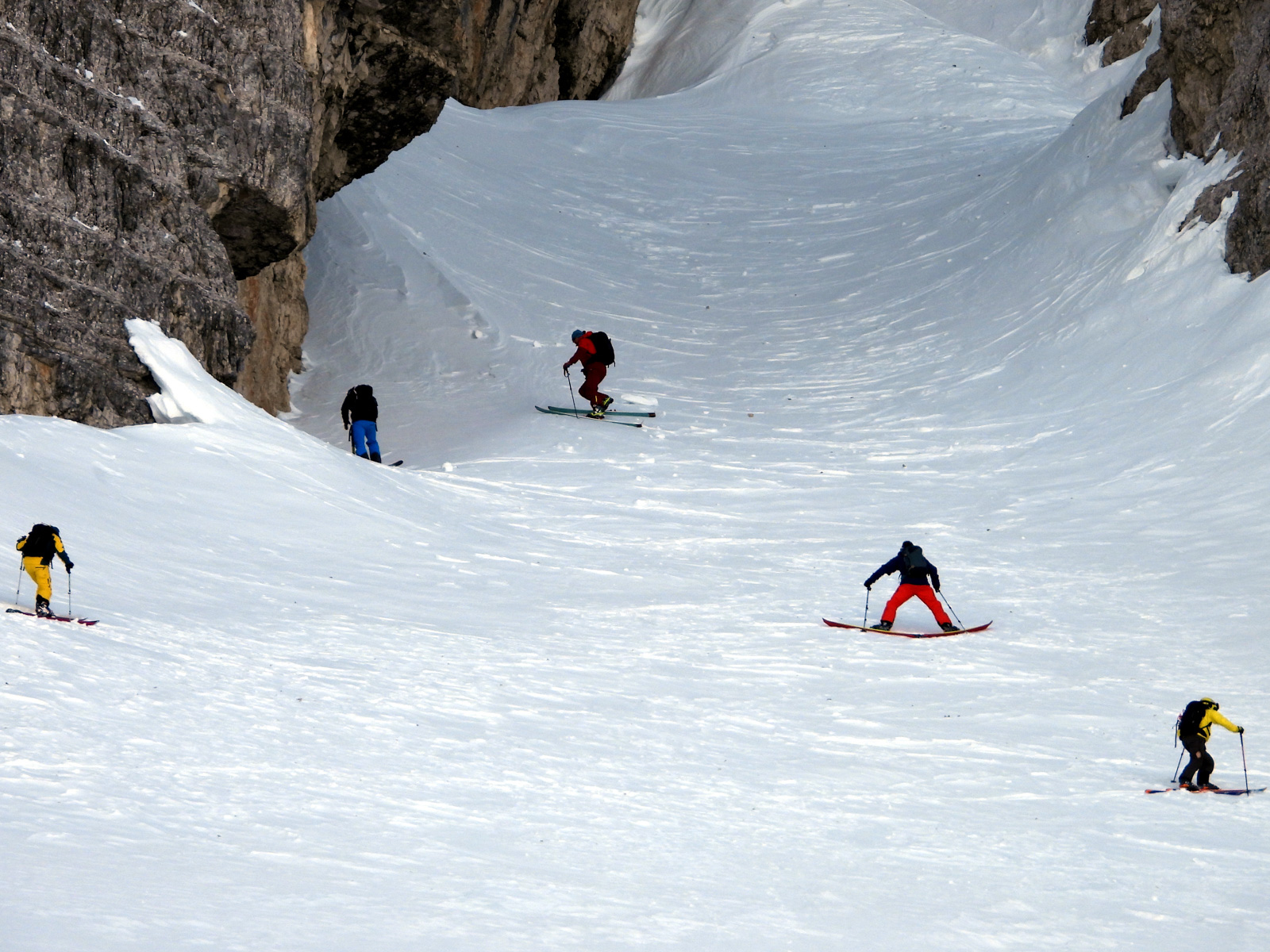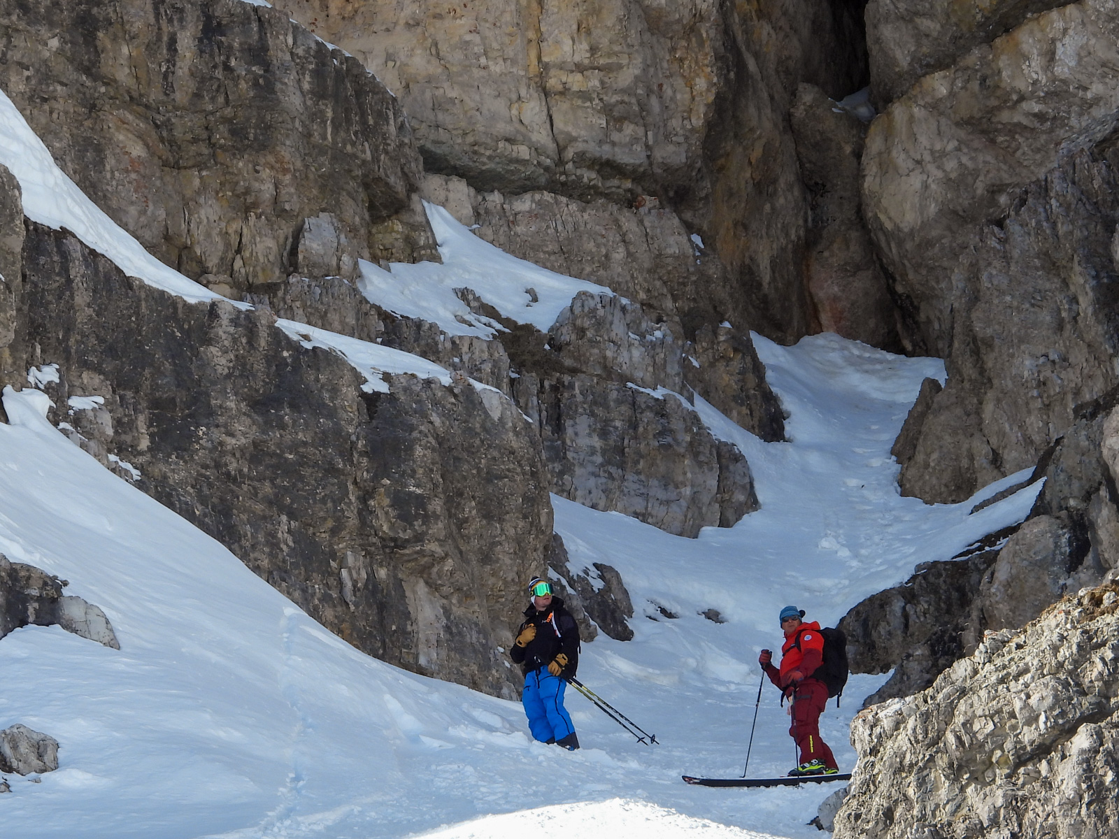 Milieu de semaine, direction le domaine de Cinque Torri. Une nuitée est organisée dans le refuge Scoiattoli sur les pistes. Une petite randonnée se fait de nuit pour rejoindre le refuge Averau, mais c’est sans compter la tempête qui se lève. La descente est un peu extrême. Nous dégustons ensuite le repas du soir bien mérité, avant de refaire le monde et de goûter à un breuvage local qui n’est pas sans nous rappeler un certain «Diablerets». Excellent! Le lendemain, nous nous rendons sur le domaine de Lagazuoi (la montagne creusée pendant la guerre est remplie d’explosifs, pour contrer les autrichiens) pour redescendre ensuite en direction de Forcella Tavenanzes.